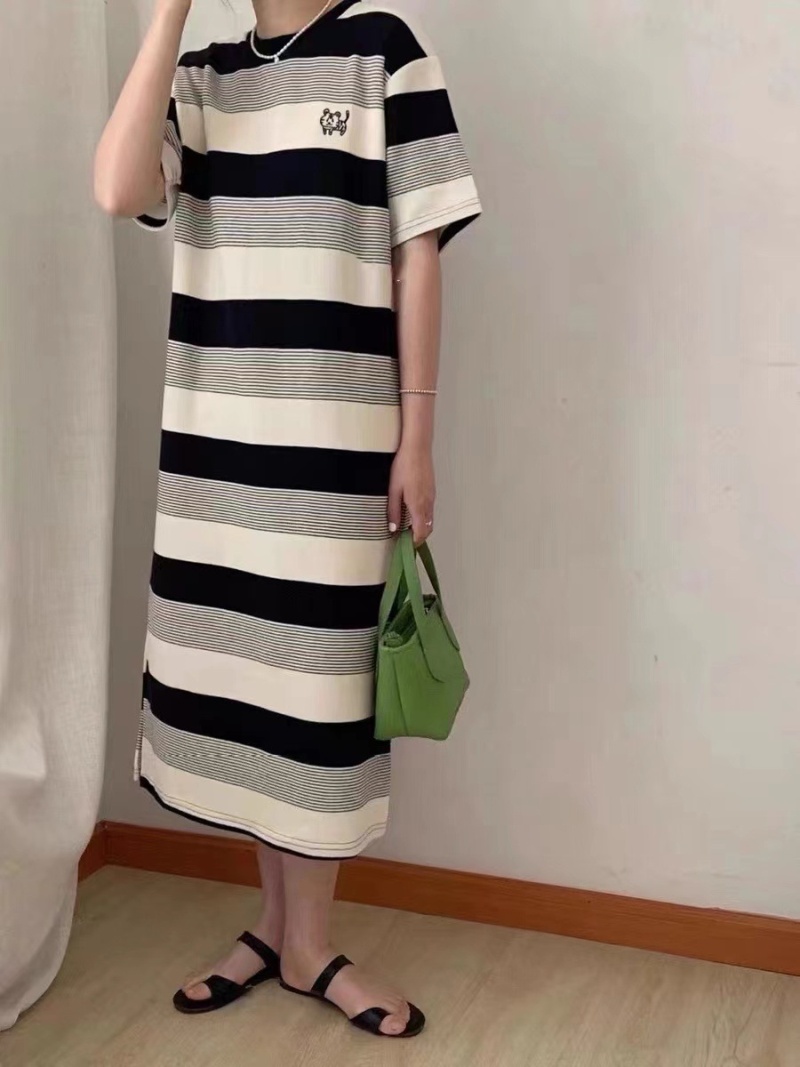 新款慵懒风圆领老虎刺绣撞色开叉条纹宽松短袖群简约中长款连衣裙