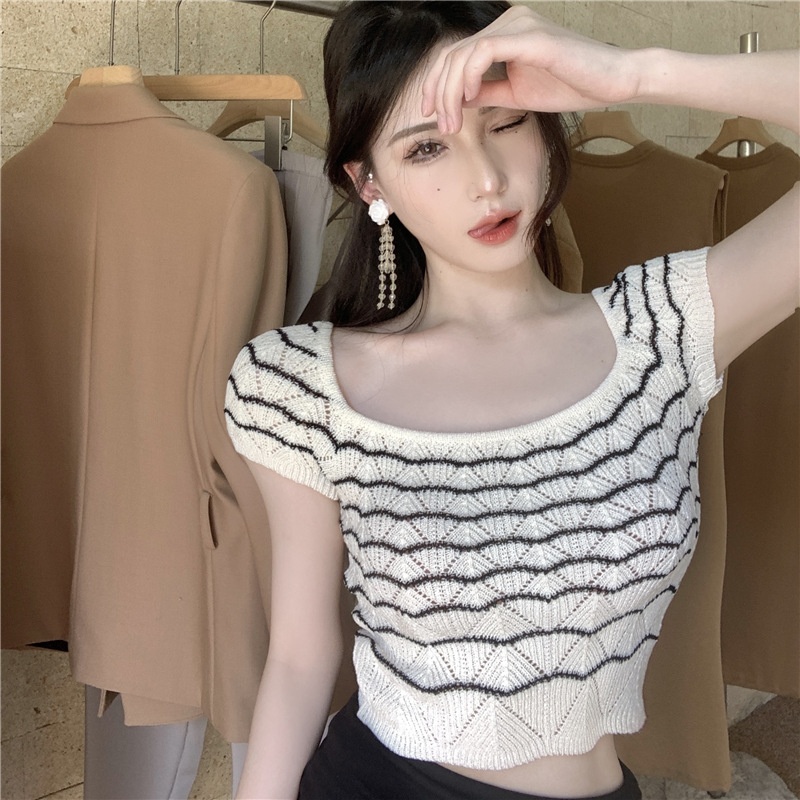 复古通勤条纹薄款方领上衣设计感小众修身显锁骨冰曲针织衫短袖女