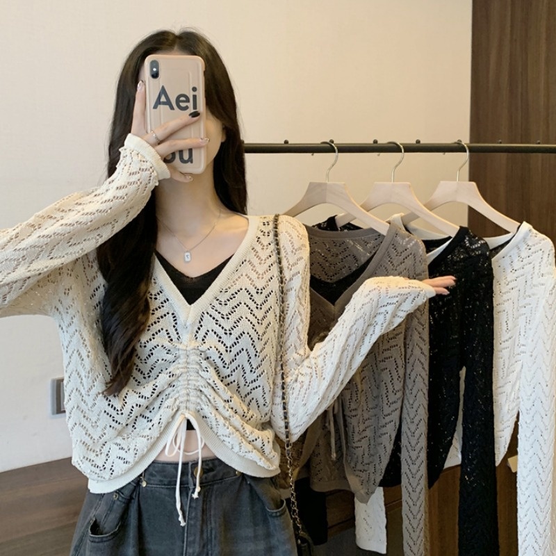 V领镂空抽绳长袖针织衫女早秋新款宽松减龄设计感纯欲风短款上衣