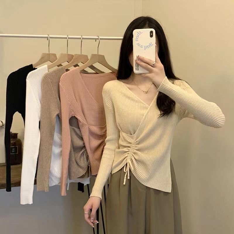 设计感小众V领打底衫女秋冬季女装新款修身抽绳长袖上衣针织衫女