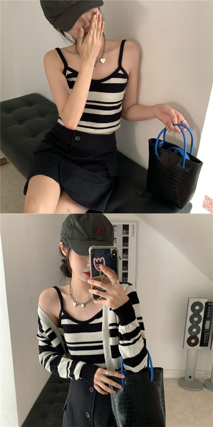 吊带背心女春秋新款开衫两件套辣妹外套短款高腰外搭条纹针织毛衣