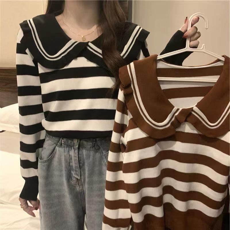 娃娃领条纹长袖宽松显瘦小个子针织衫秋冬季减龄甜美可爱上衣女潮