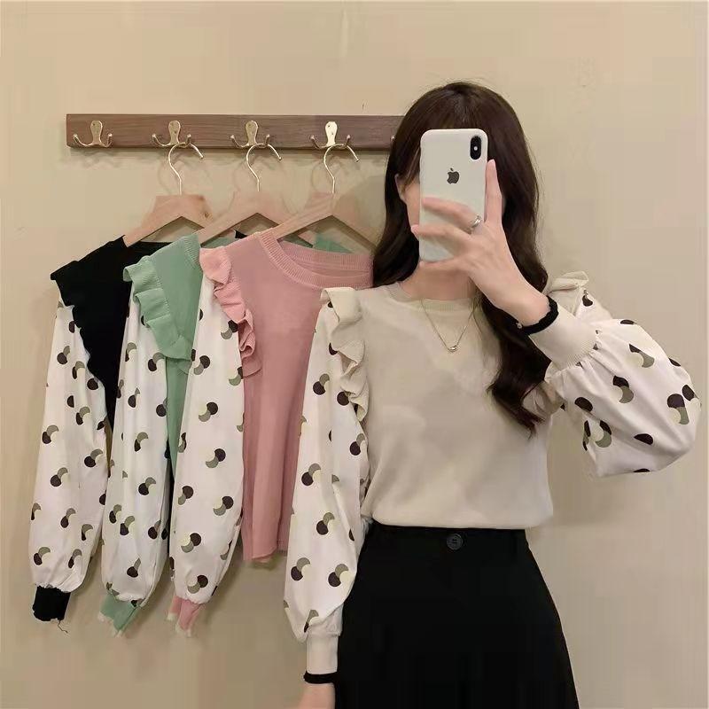 秋冬季套头气质拼接袖子圆领针织衫女韩版新款短款长袖可爱上衣女