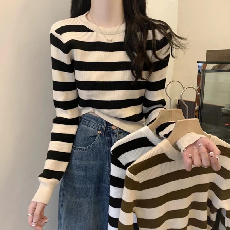 圆领套头条纹长袖针织衫女秋冬季女装新款修身显瘦内搭打底衫上衣