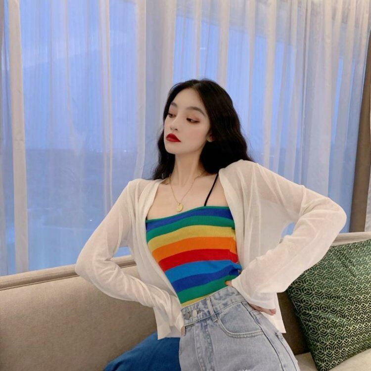 夏季薄款小披肩长袖外套防晒衫上衣冰丝针织吊带背心内搭两件套女