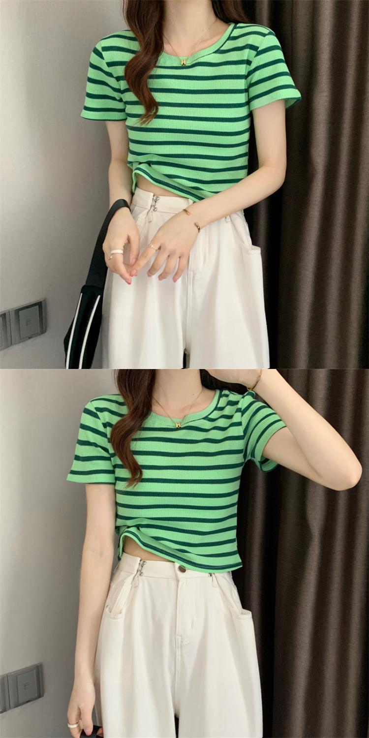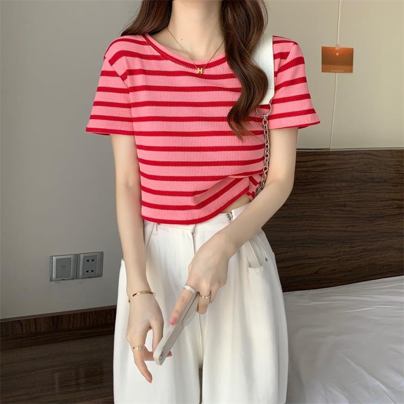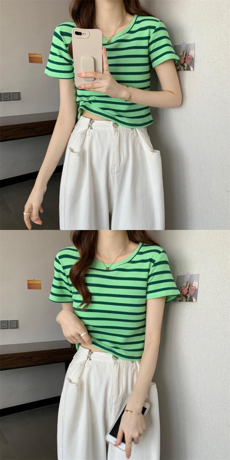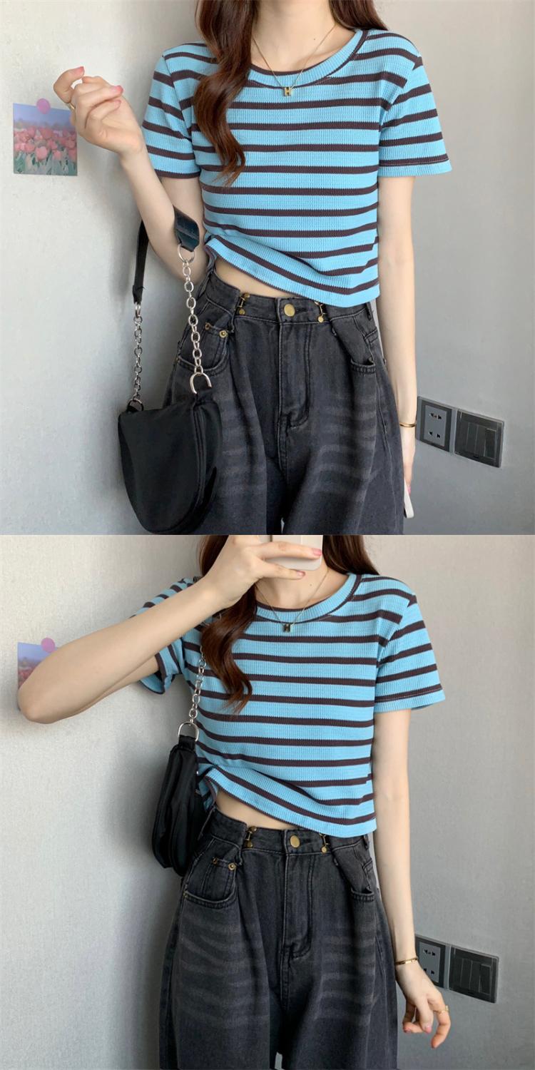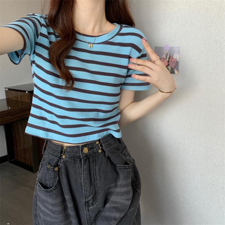 2022夏季新款韩版轻熟设计感时尚洋气圆领短款上衣撞色条纹短袖女