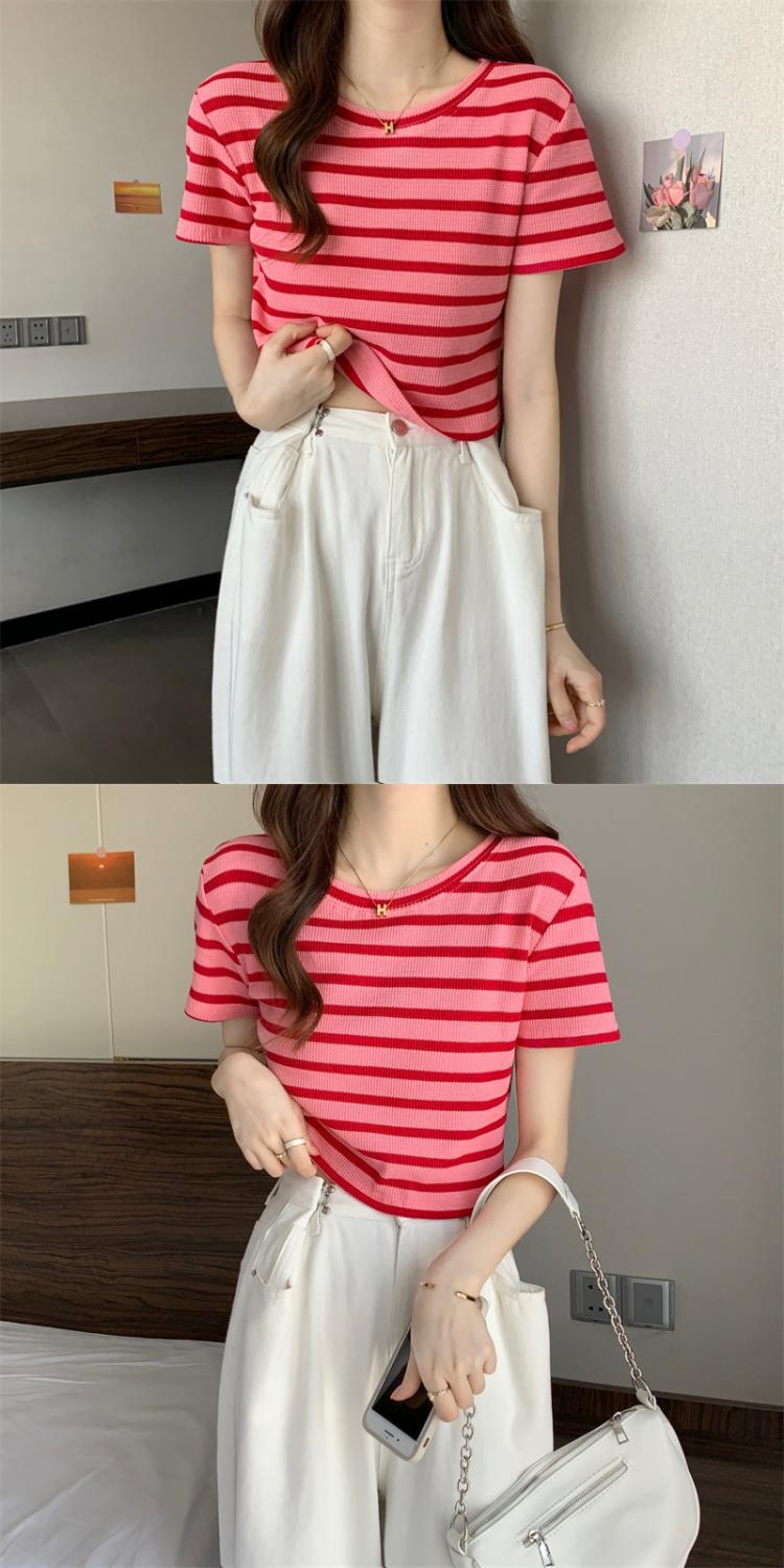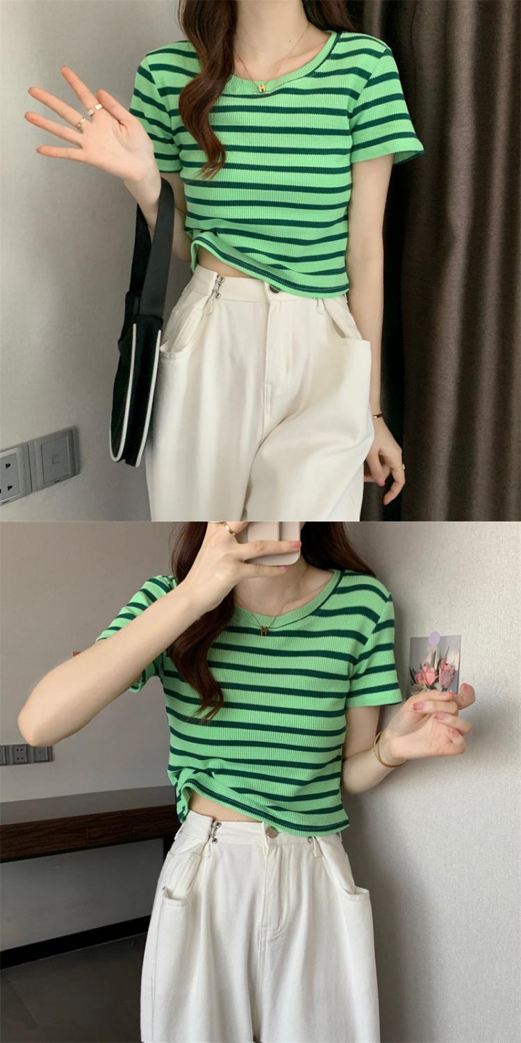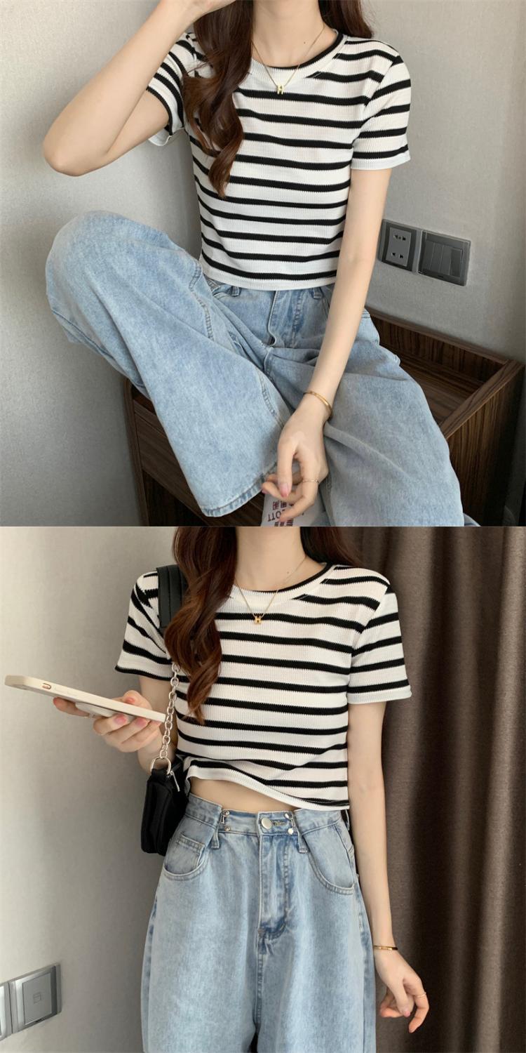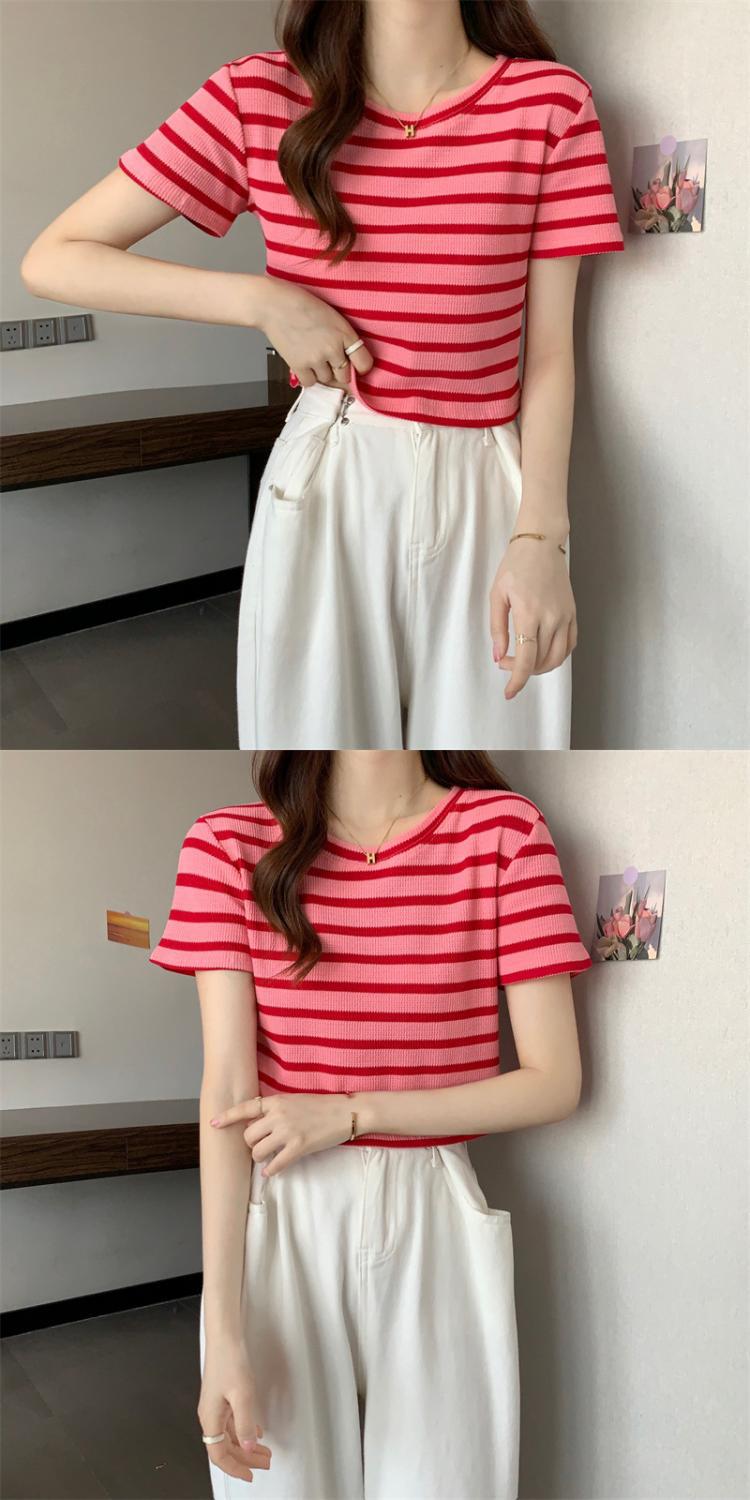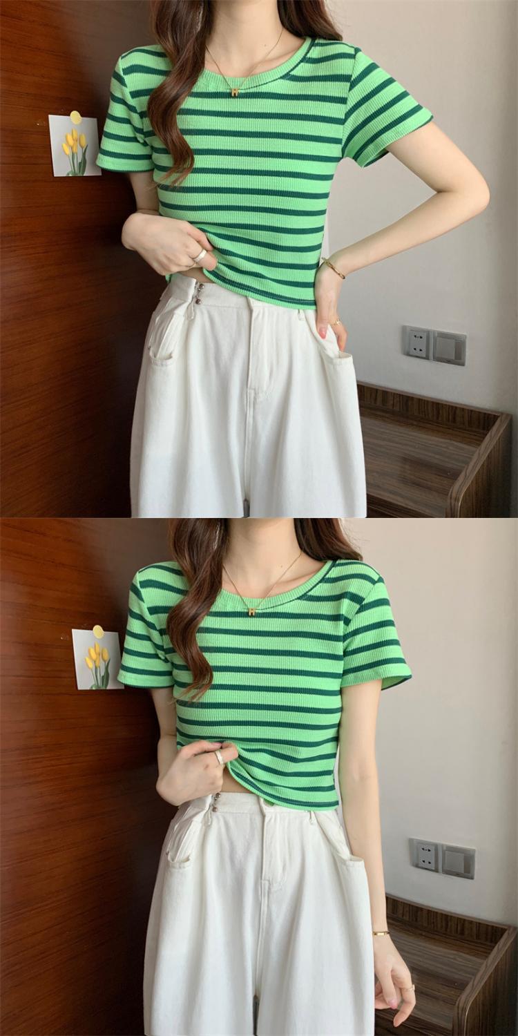 2022夏季新款韩版轻熟设计感时尚洋气圆领短款上衣撞色条纹短袖女