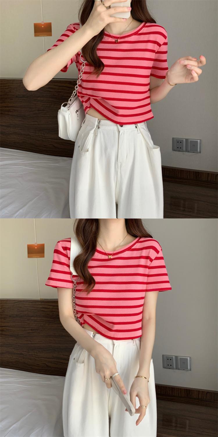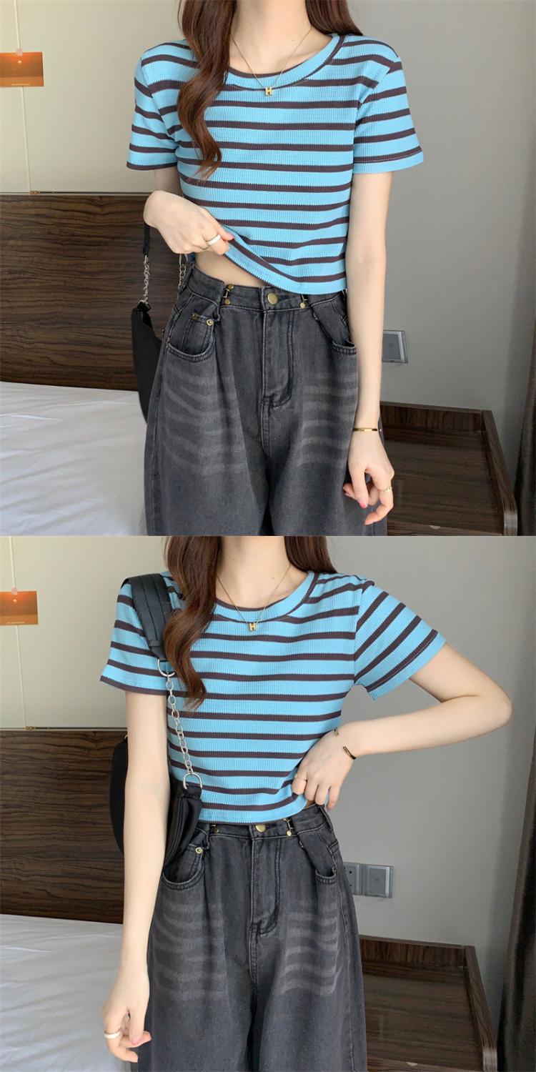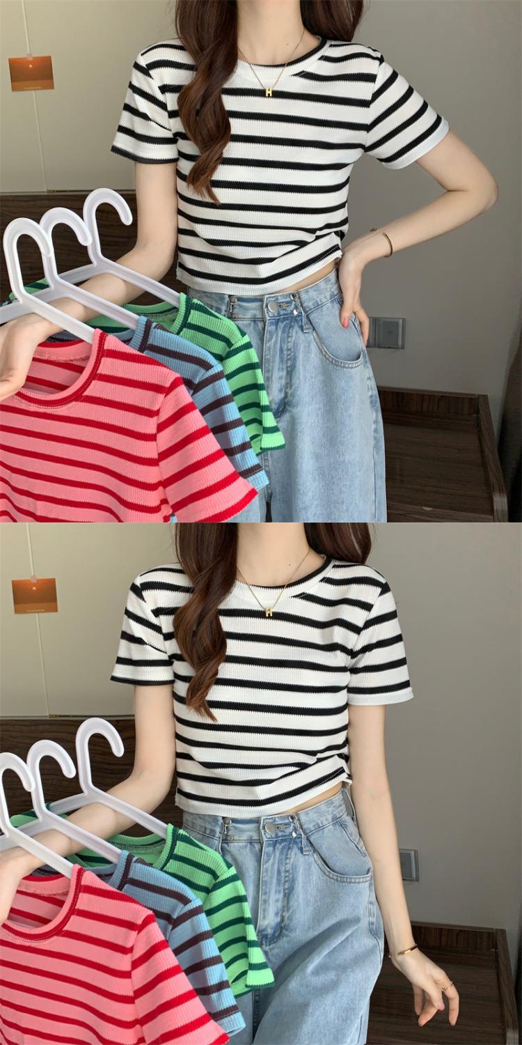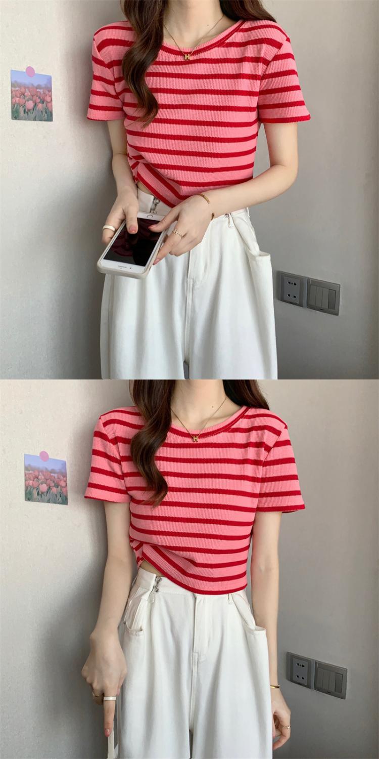 2022夏季新款韩版轻熟设计感时尚洋气圆领短款上衣撞色条纹短袖女