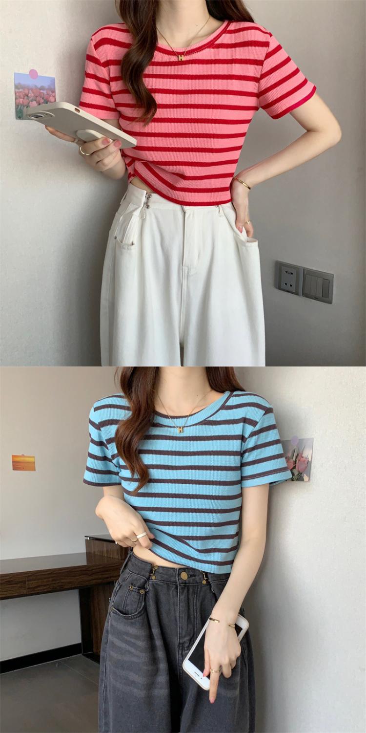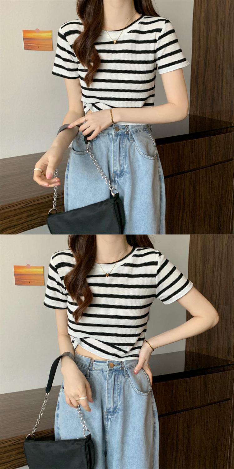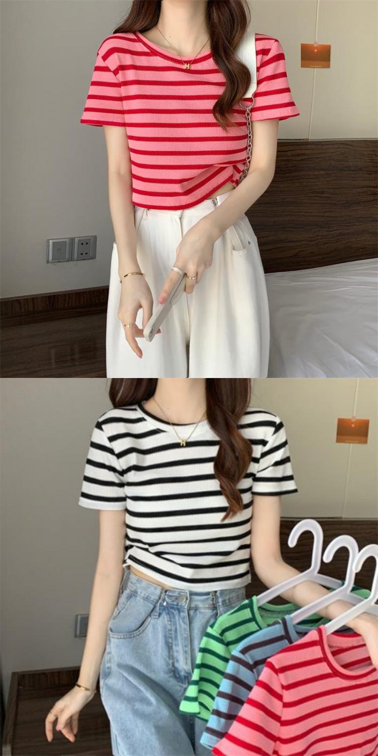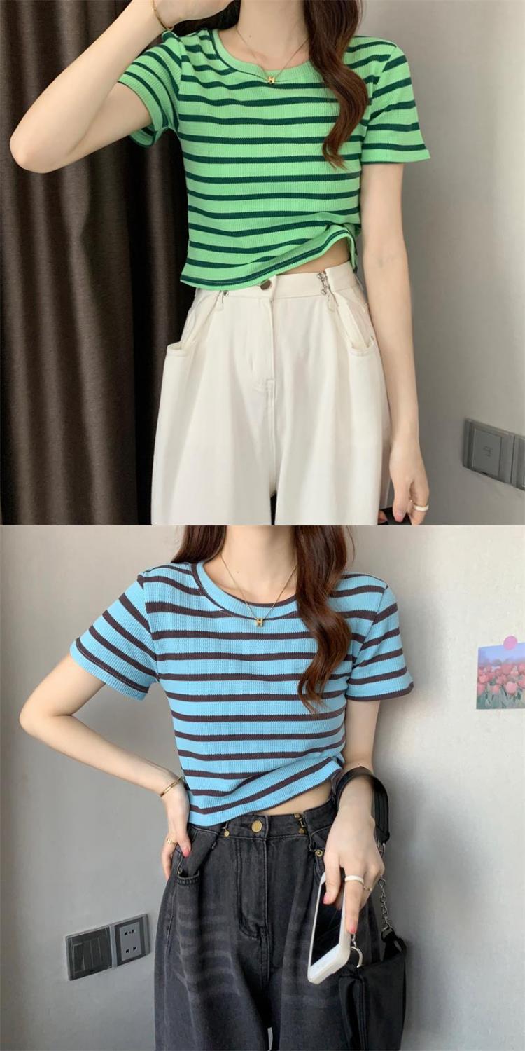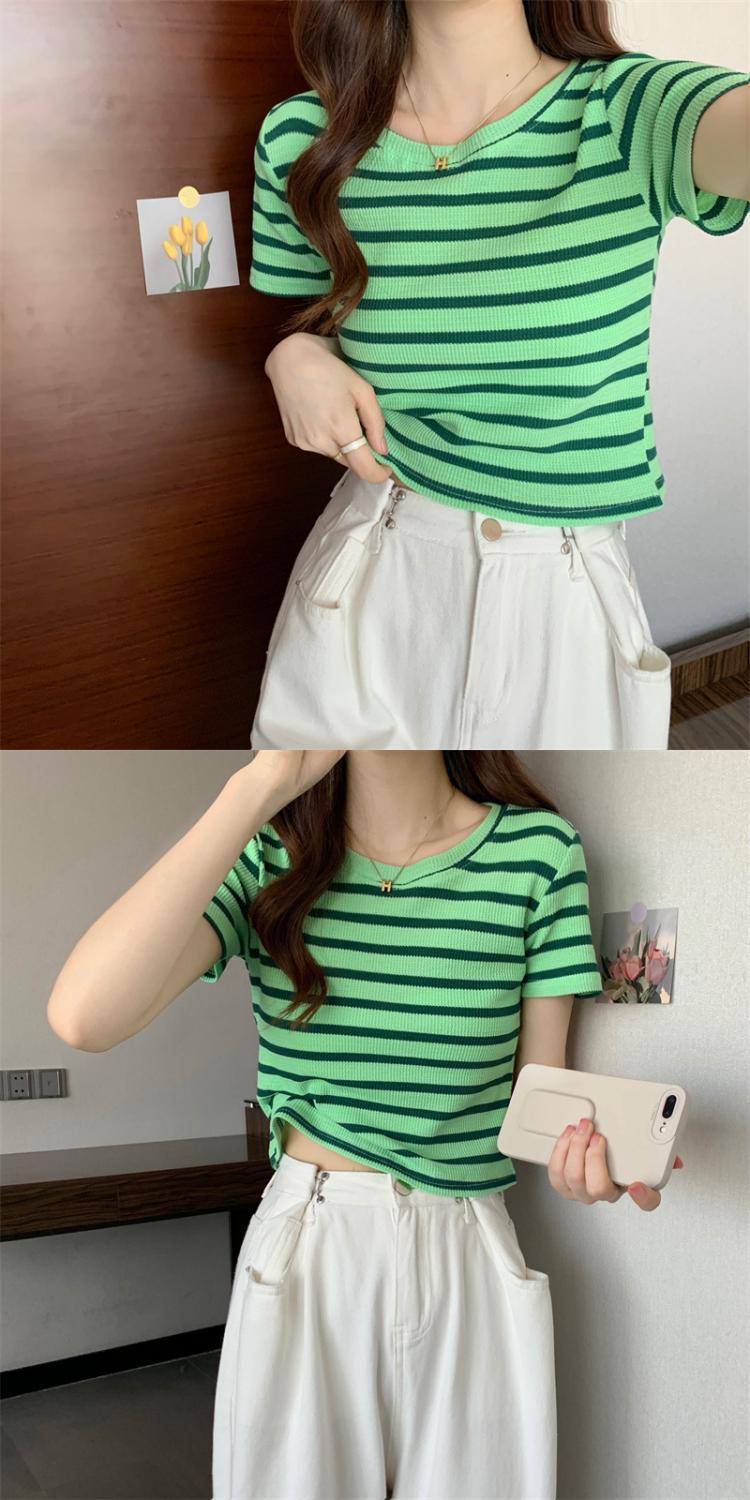 2022夏季新款韩版轻熟设计感时尚洋气圆领短款上衣撞色条纹短袖女