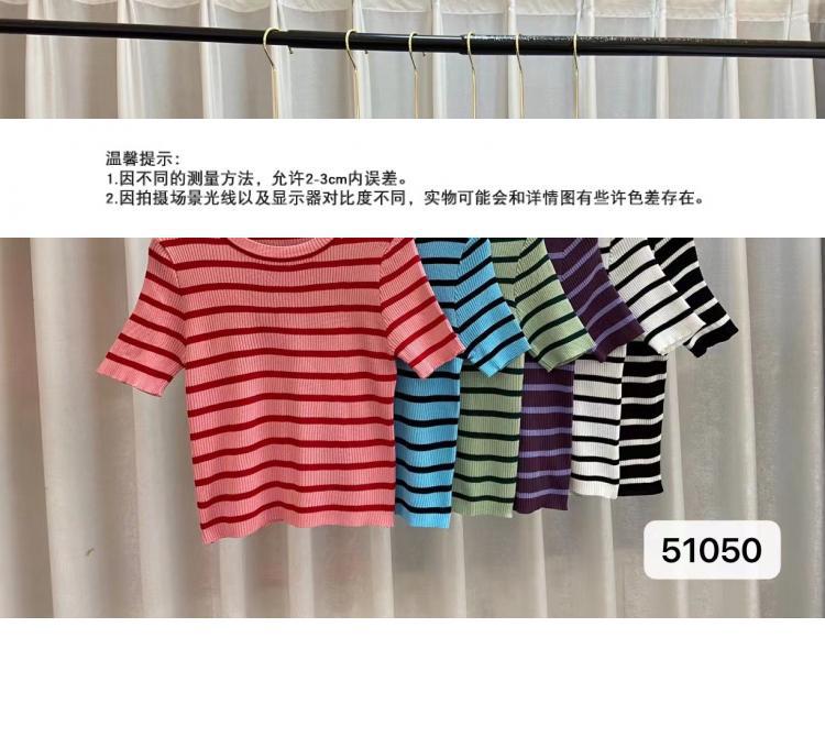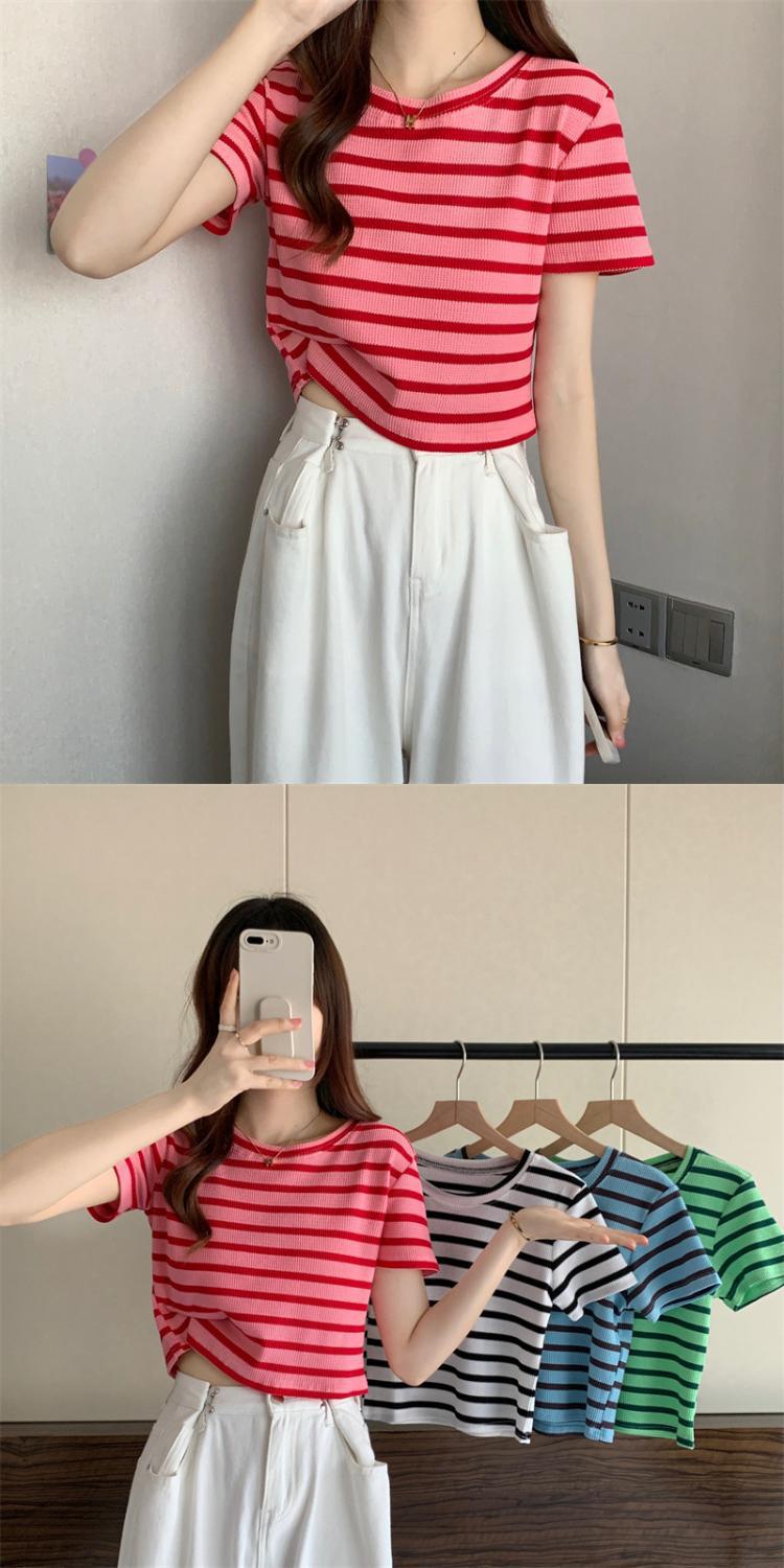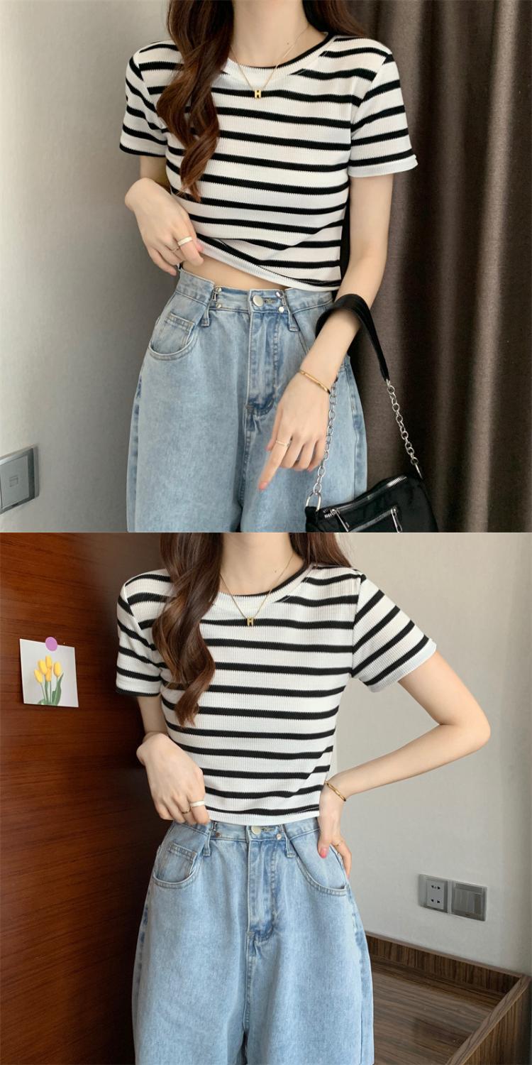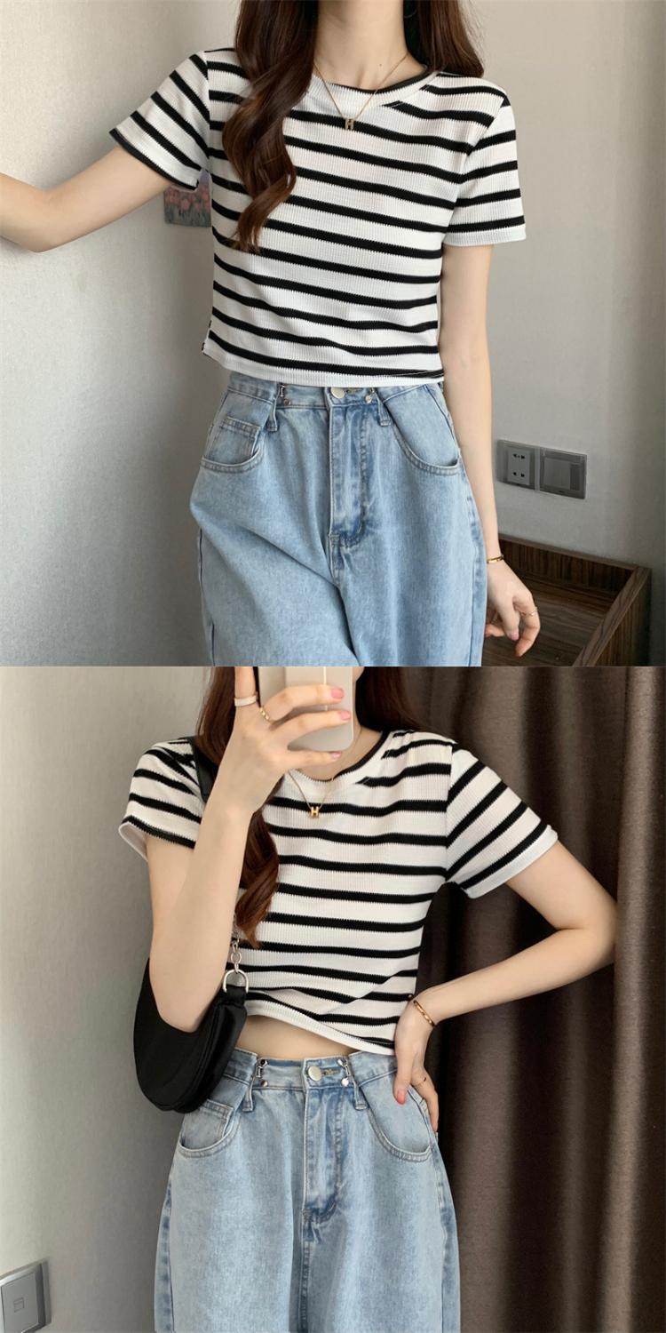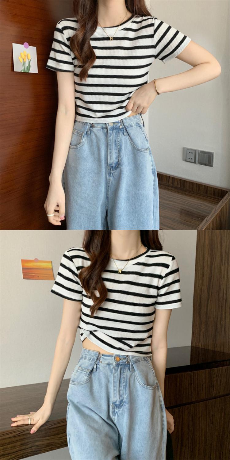 2022夏季新款韩版轻熟设计感时尚洋气圆领短款上衣撞色条纹短袖女