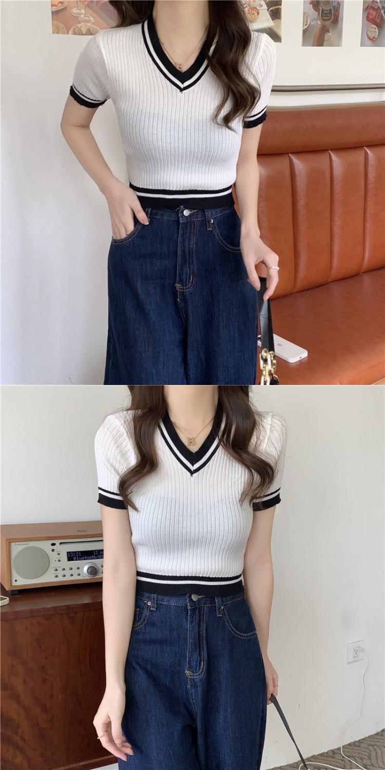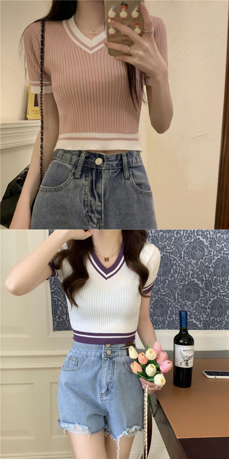 2023年新款夏季女装小个子短款显瘦修身撞色V领短袖针织衫T恤韩版