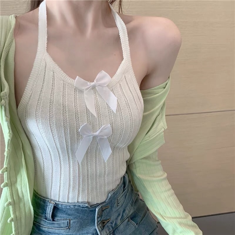 蝴蝶结吊带女夏外穿设计感挂脖短款针织背心辣妹性感美背无袖上衣