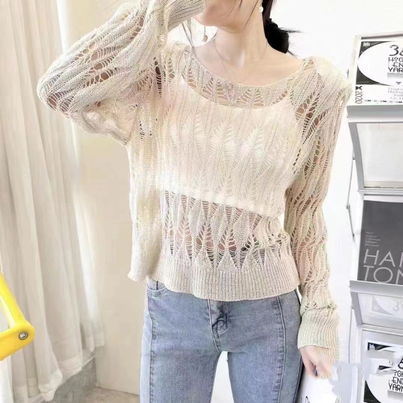 薄款套头针织罩衫女春秋长袖镂空2023新款短款宽松打底衫慵懒毛衣