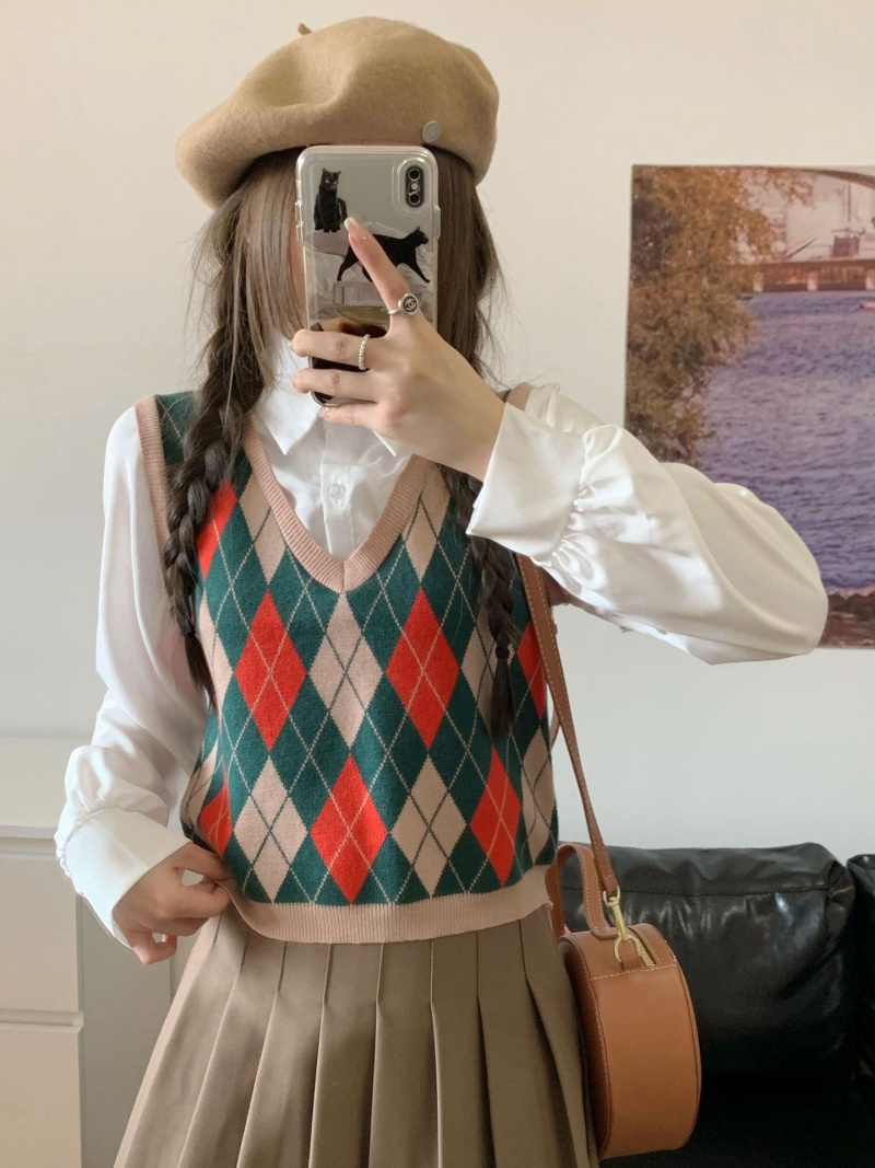 韩版校园学院风式假两件polo领菱格拼接叠穿衬衫针织衫女复古小众
