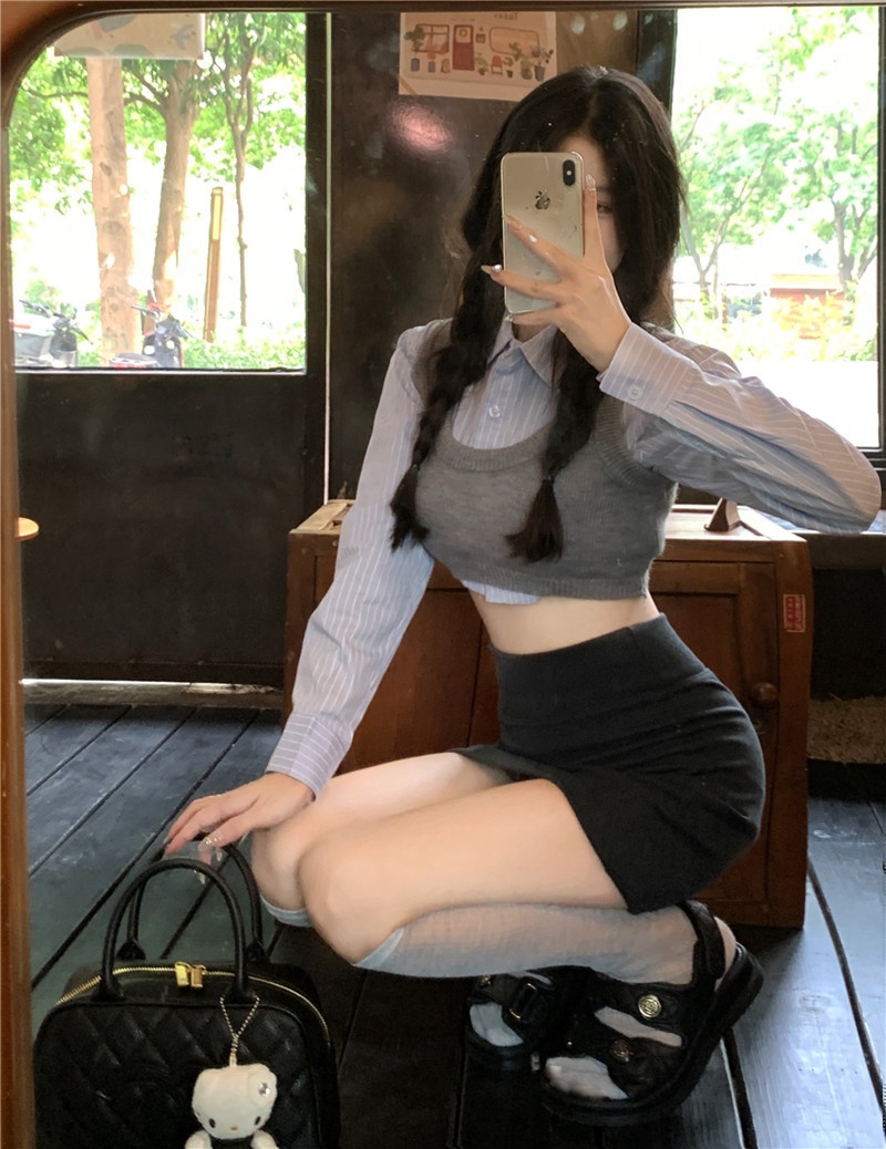 韩版网红辣妹穿搭上衣马甲纯欲气质小个子拼接棋盘针织背心上衣女