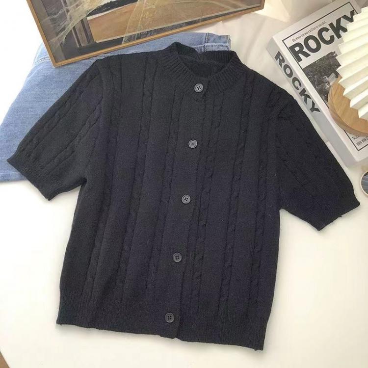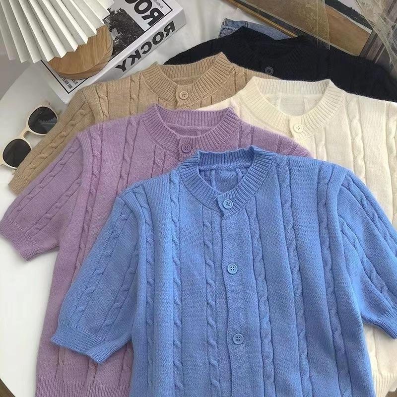 2023春季新款单排扣麻花短袖针织开衫韩版甜美百搭显瘦外穿短上衣
