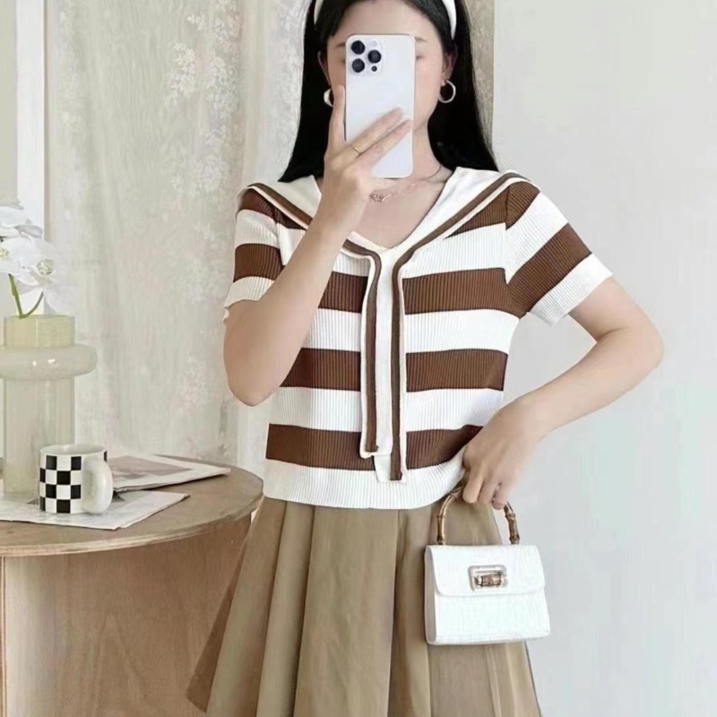2023春季新款设计感假两件条纹披肩海军领针织设计感内搭打底衫女