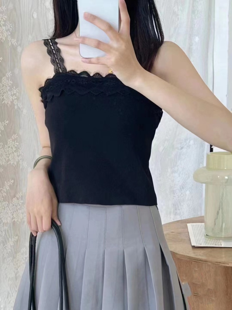 时尚设计感蕾丝边吊带2023夏季新款简约气质显瘦小众针织衫上衣女