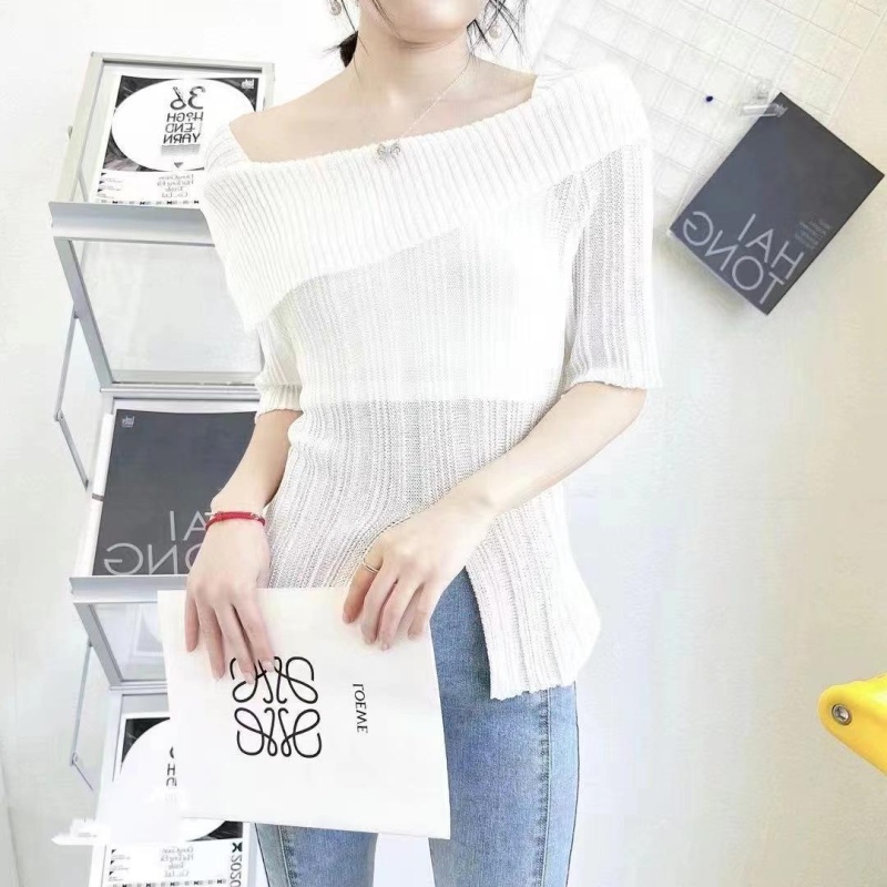 2023夏季新款一字肩不规则针织短袖薄款女修身显瘦小众别致上衣女