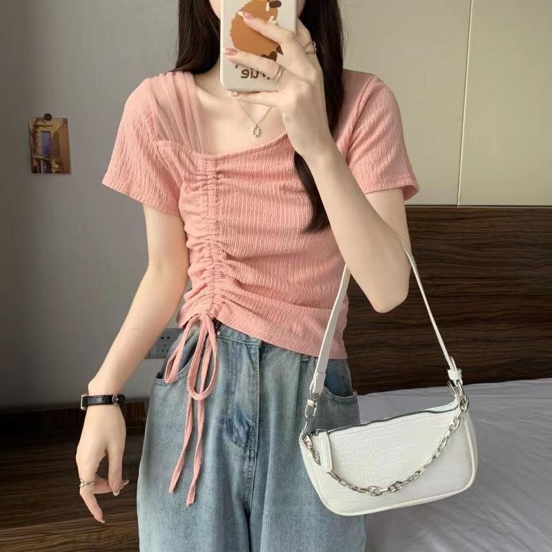 2023夏季新款独特别致网纱拼接短袖小衫设计感不规则抽绳短款上衣