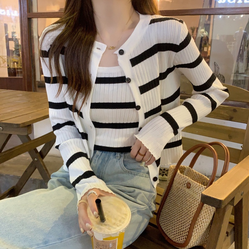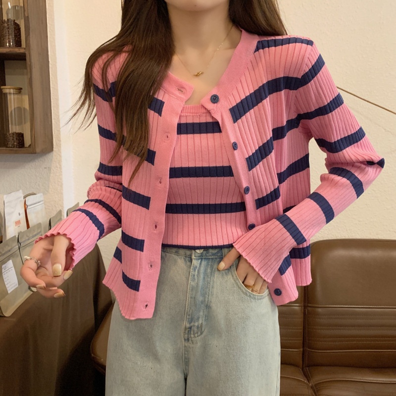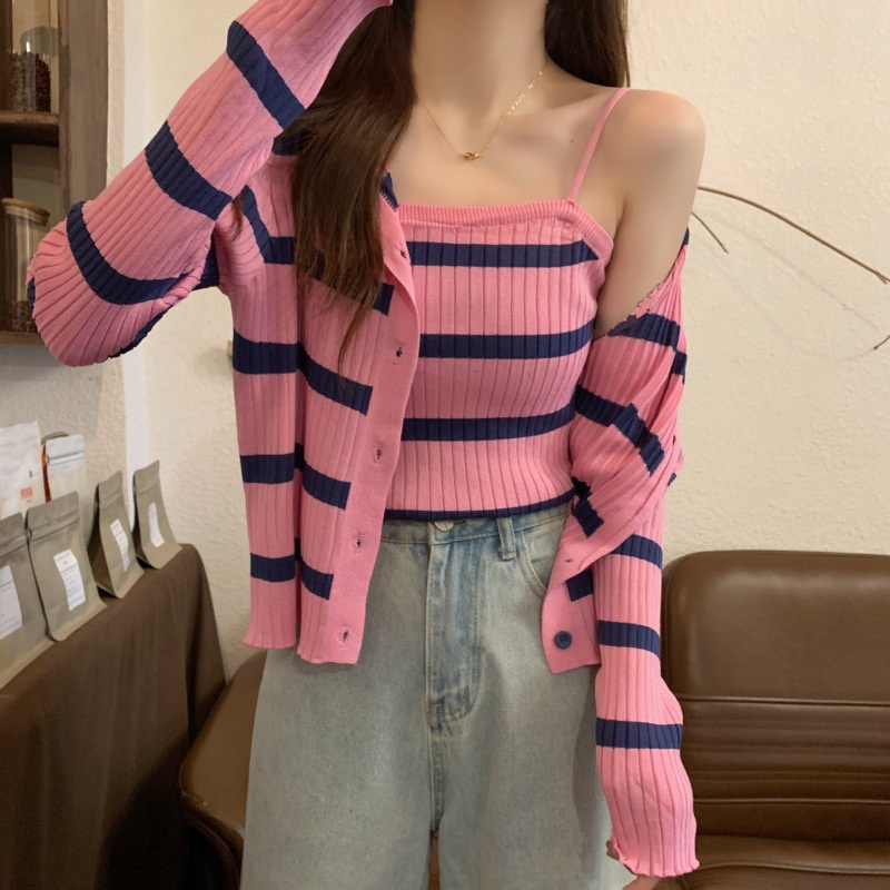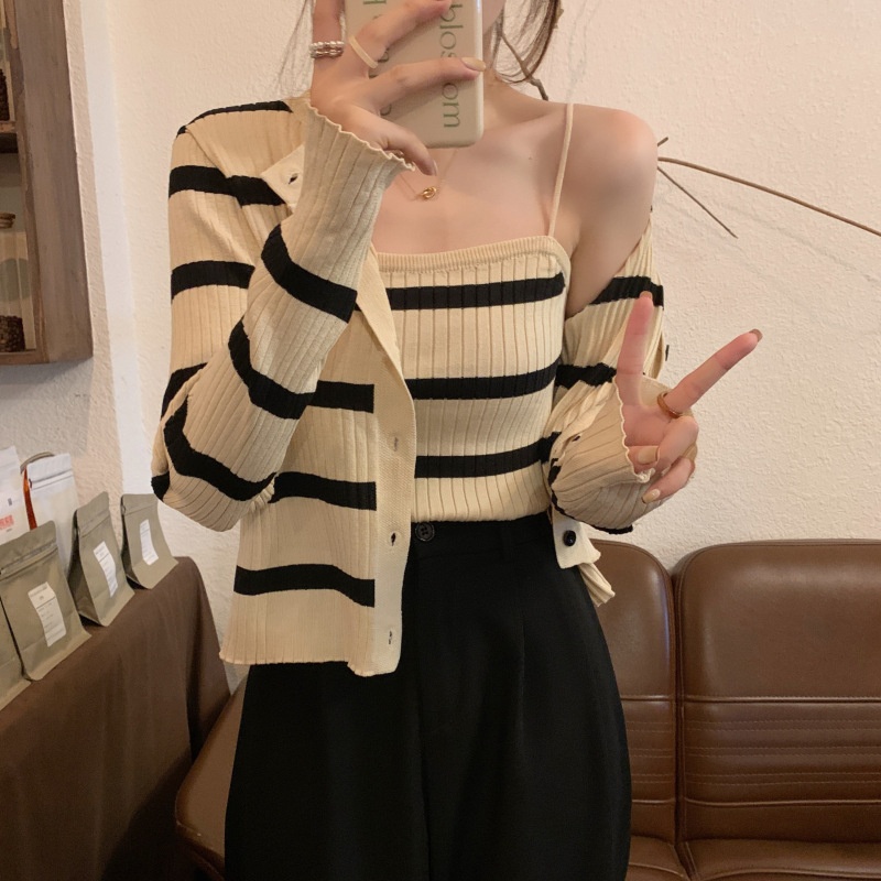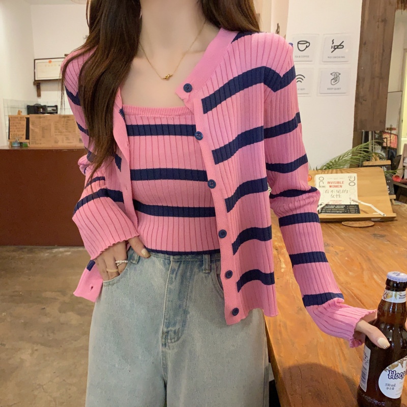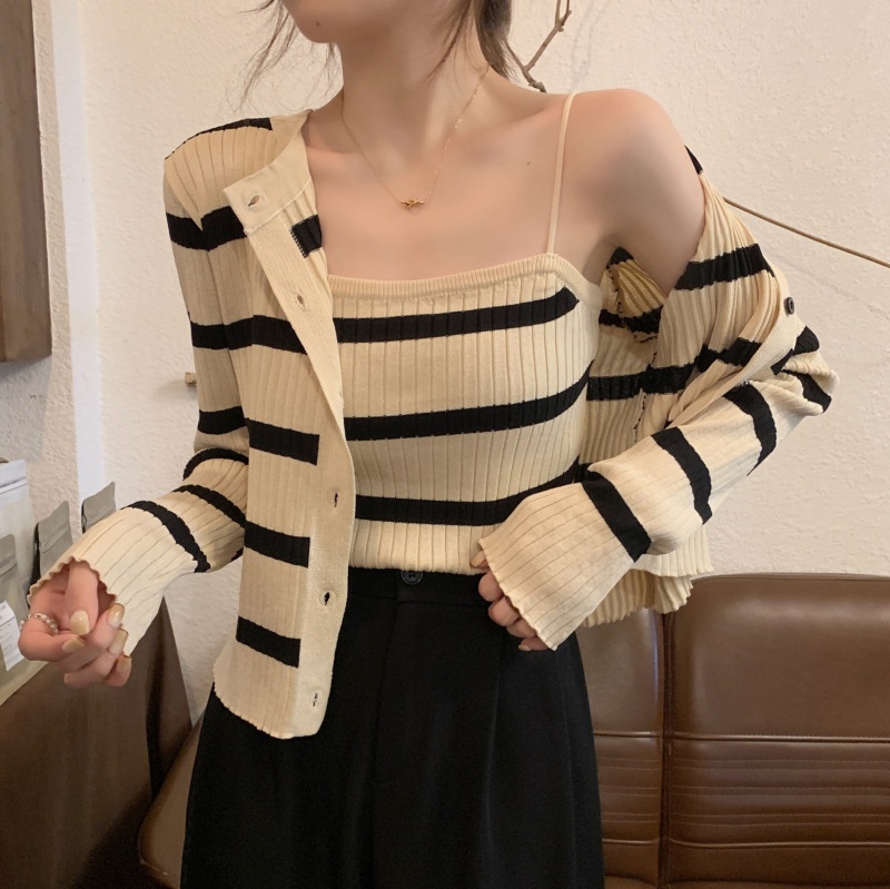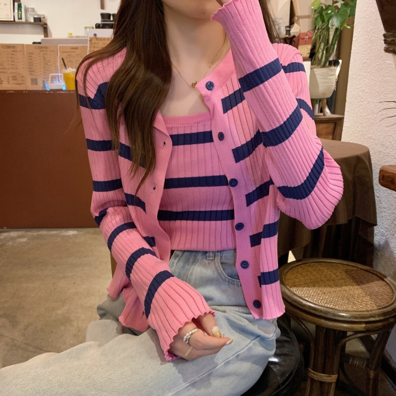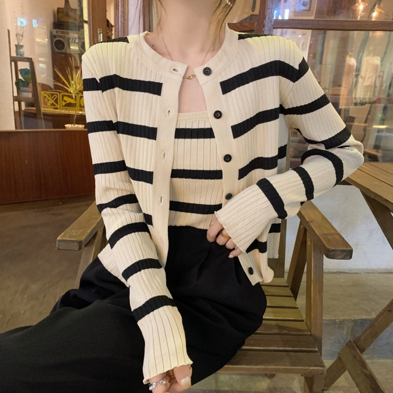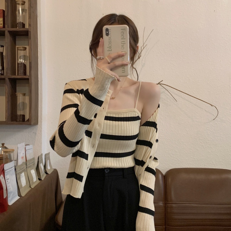 条纹两件套针织衫韩国秋季圆领长袖开衫外套吊带背心女百搭休闲潮