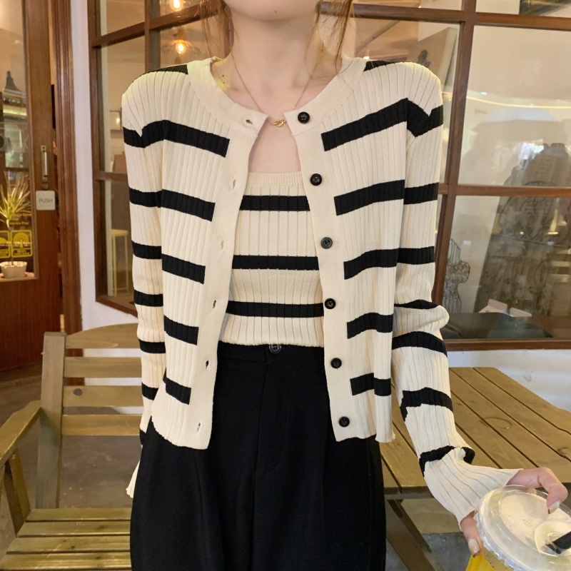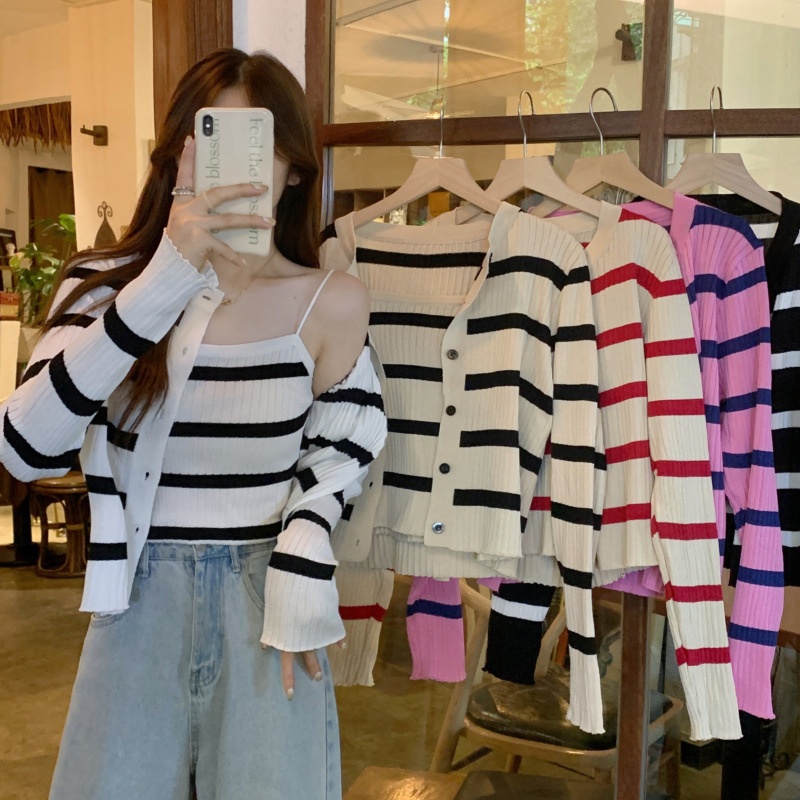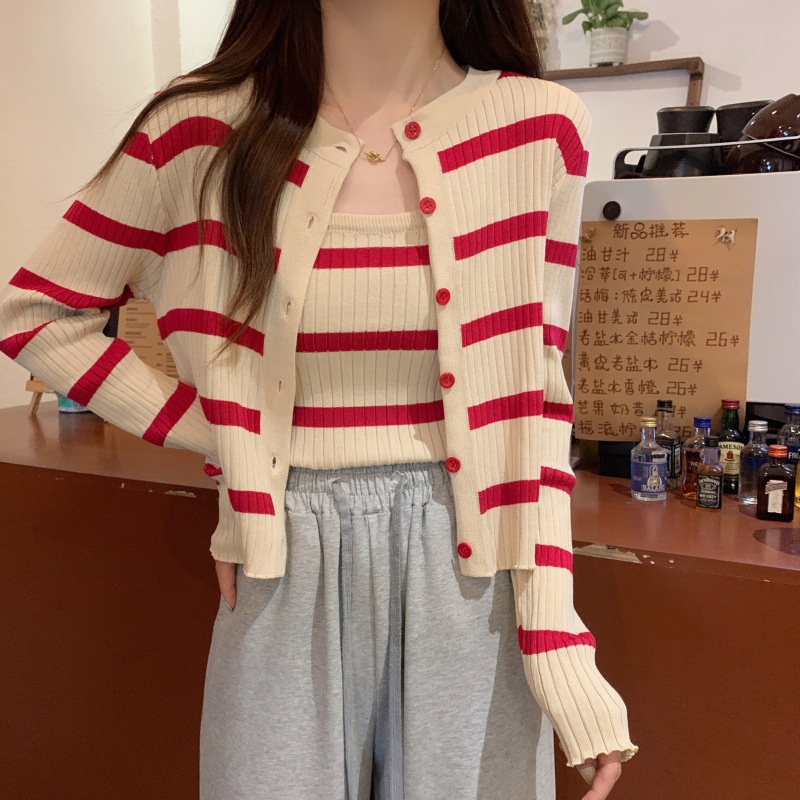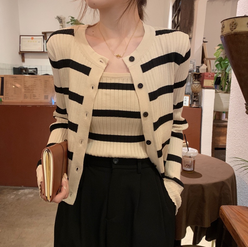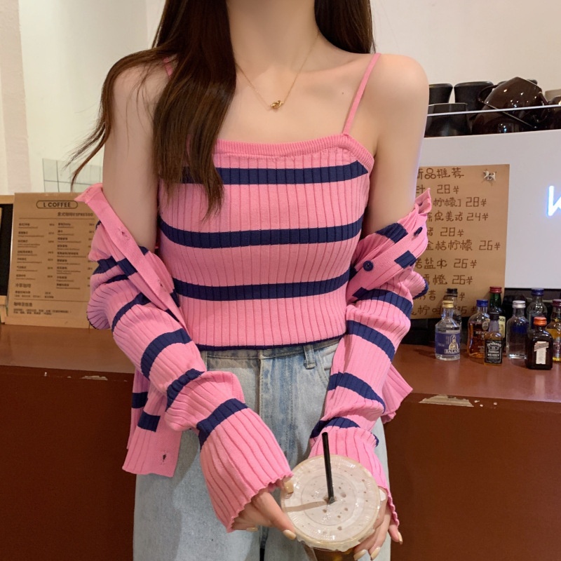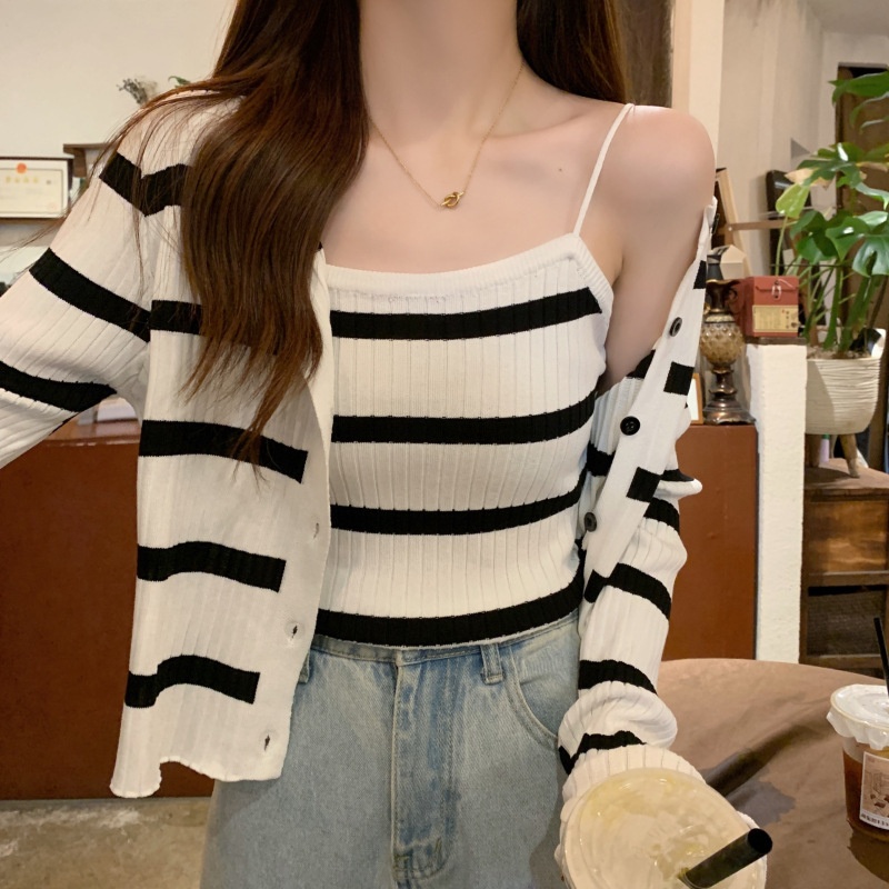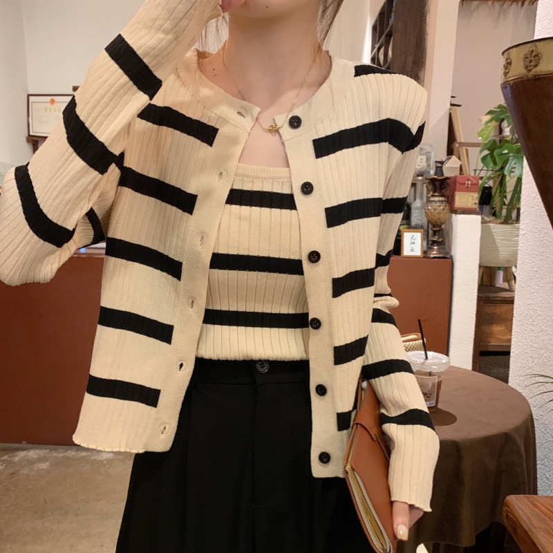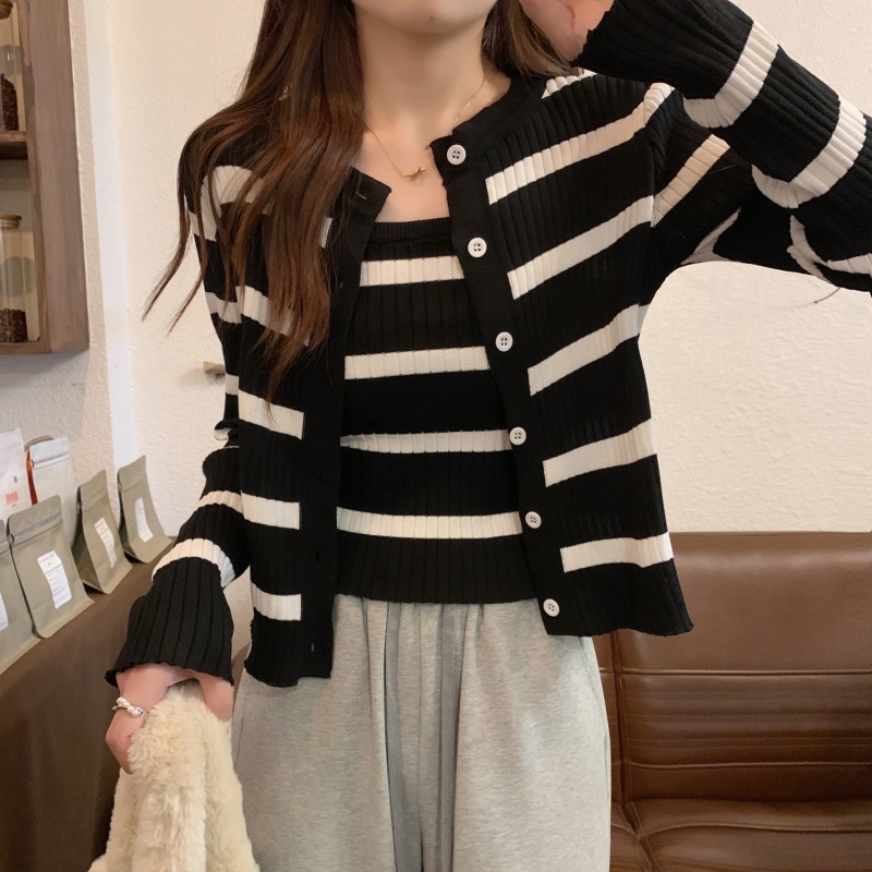 条纹两件套针织衫韩国秋季圆领长袖开衫外套吊带背心女百搭休闲潮