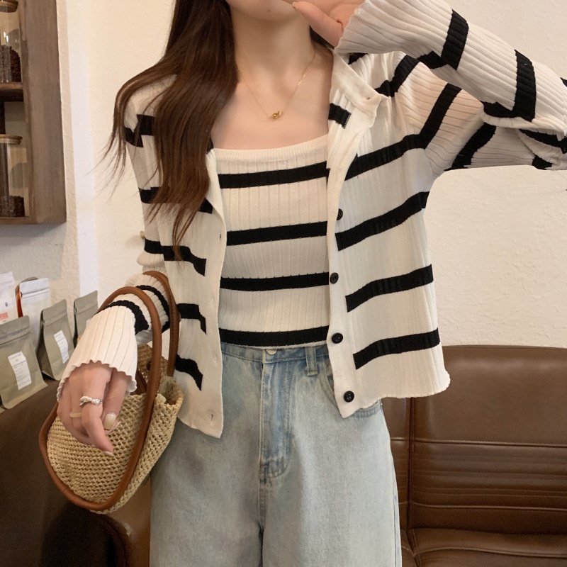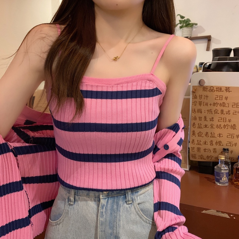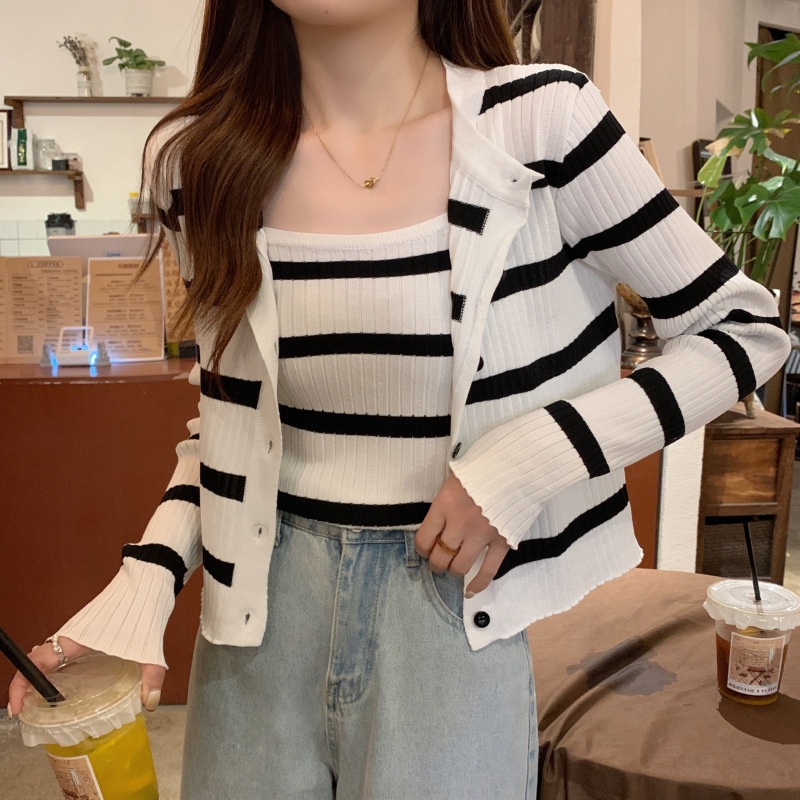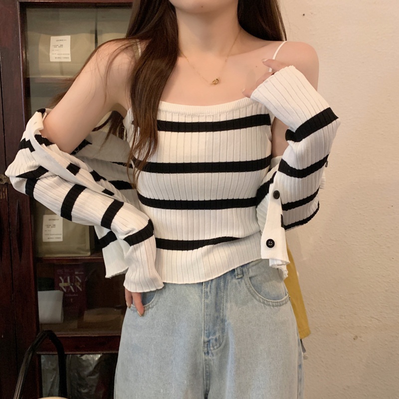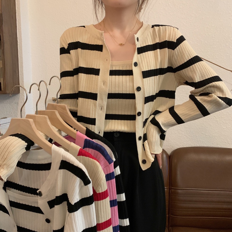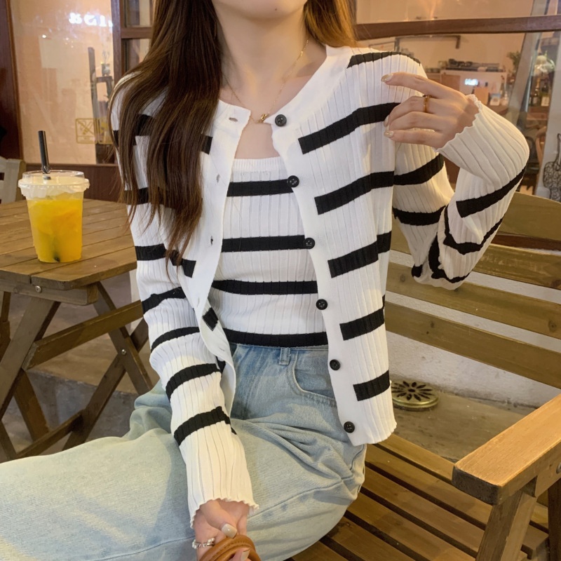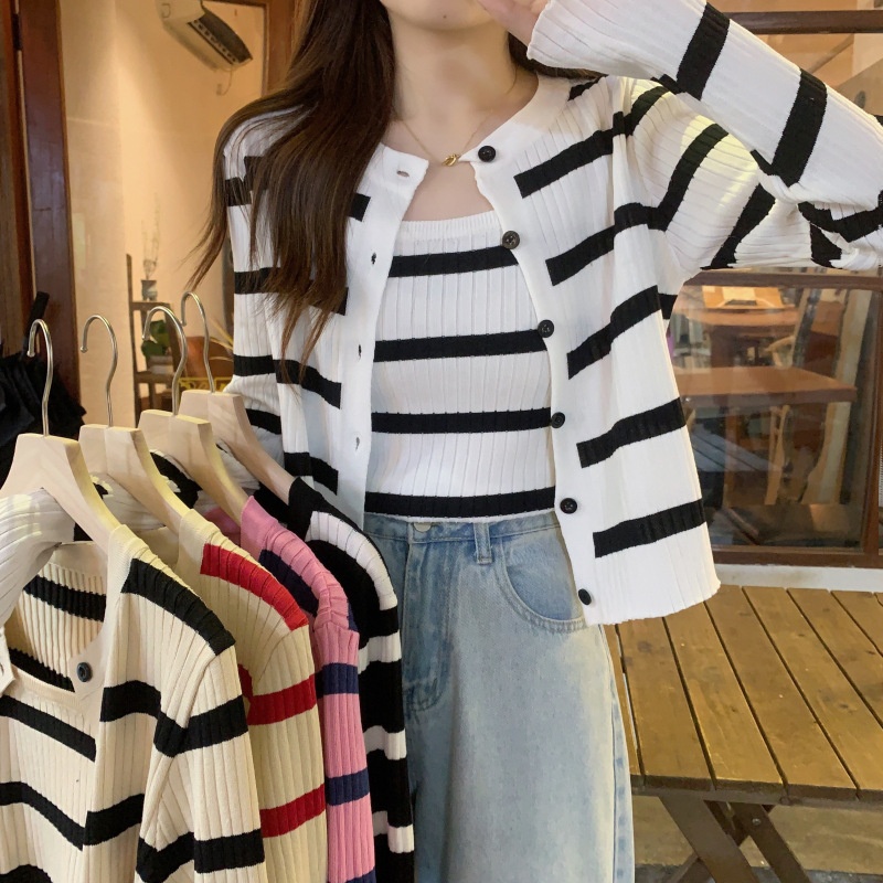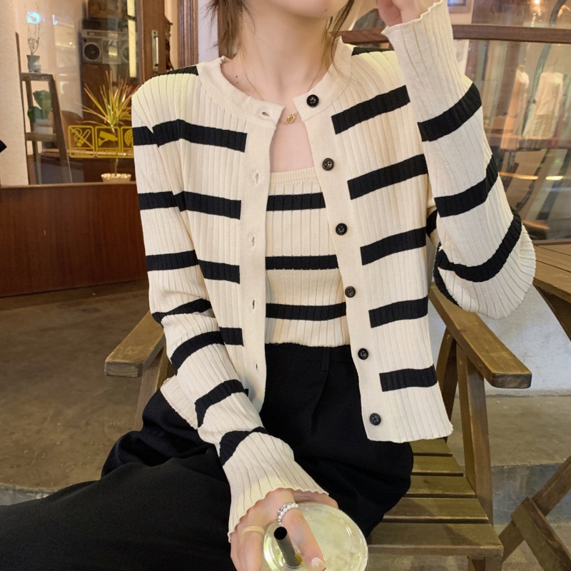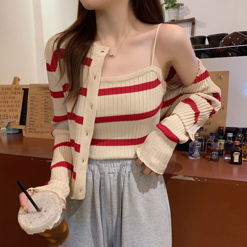 条纹两件套针织衫韩国秋季圆领长袖开衫外套吊带背心女百搭休闲潮