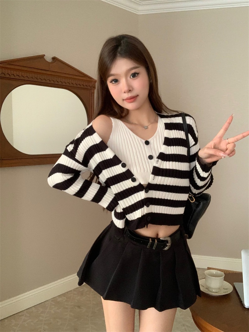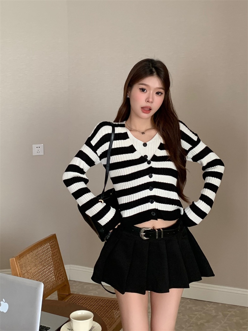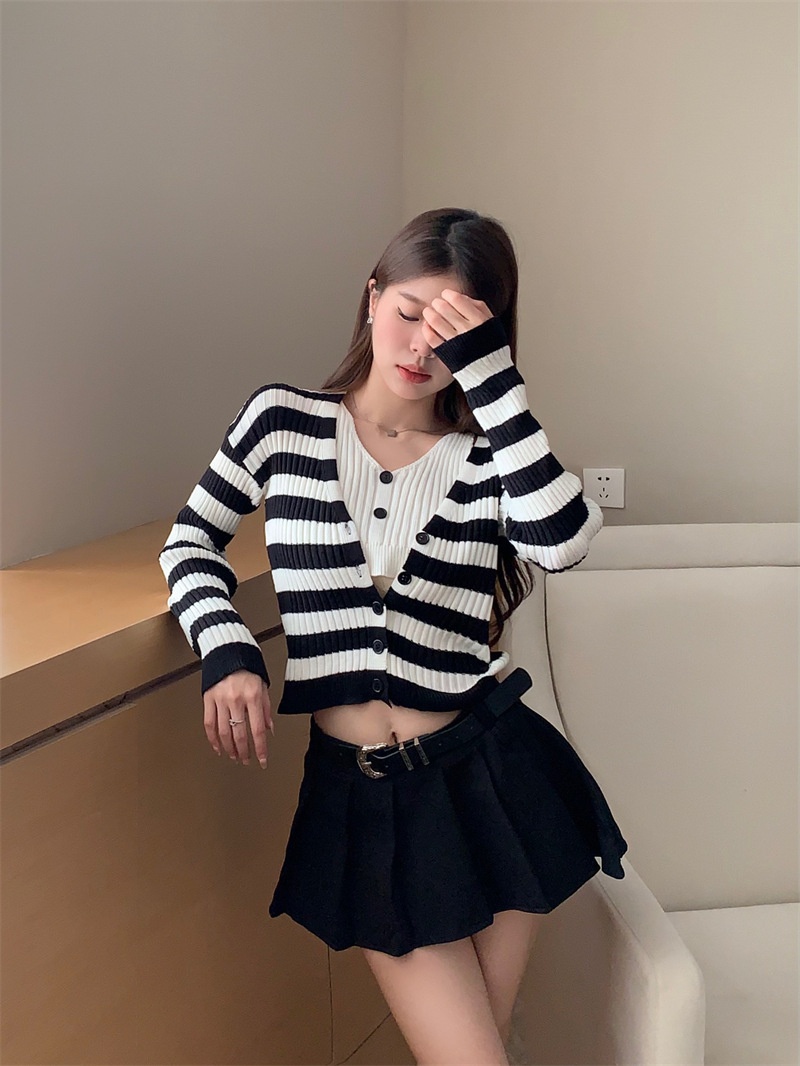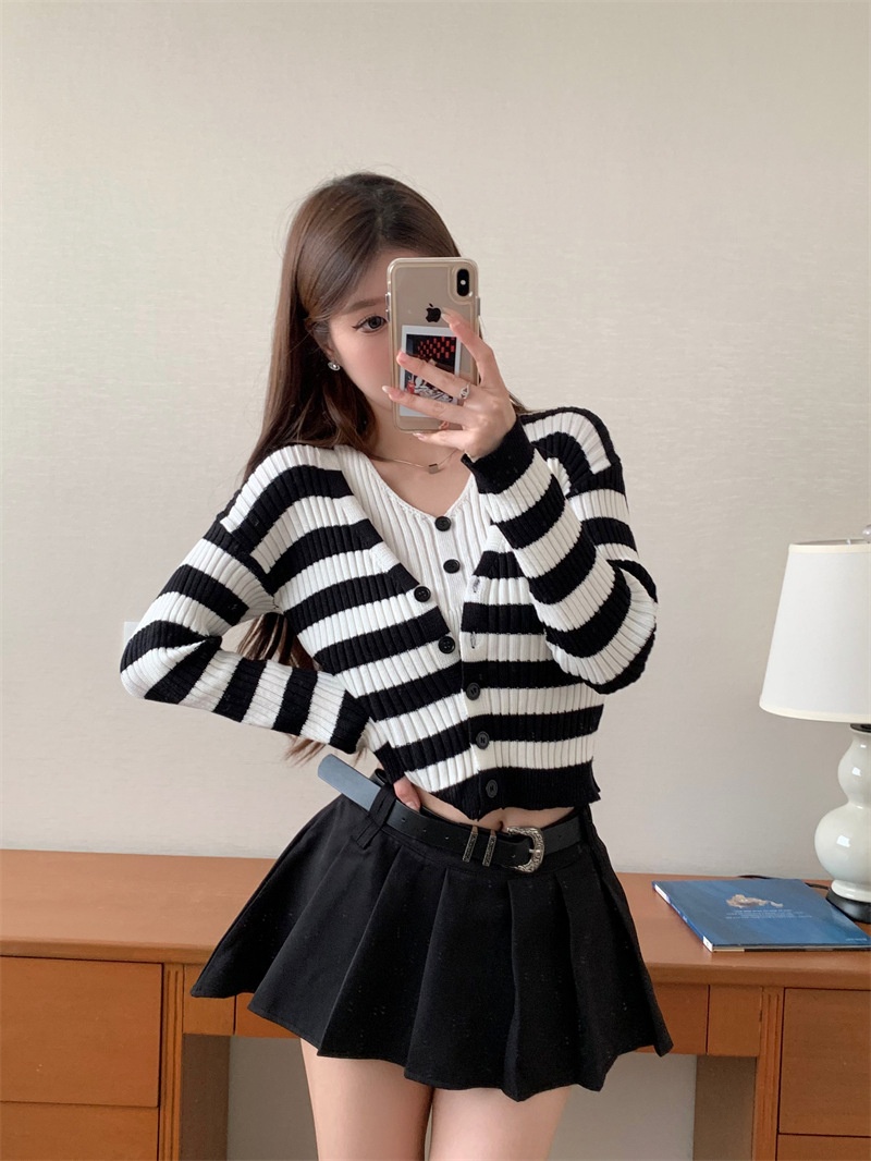 秋冬新款条纹设计感小众洋气百搭短款内搭打底上衣V领针织毛衣女