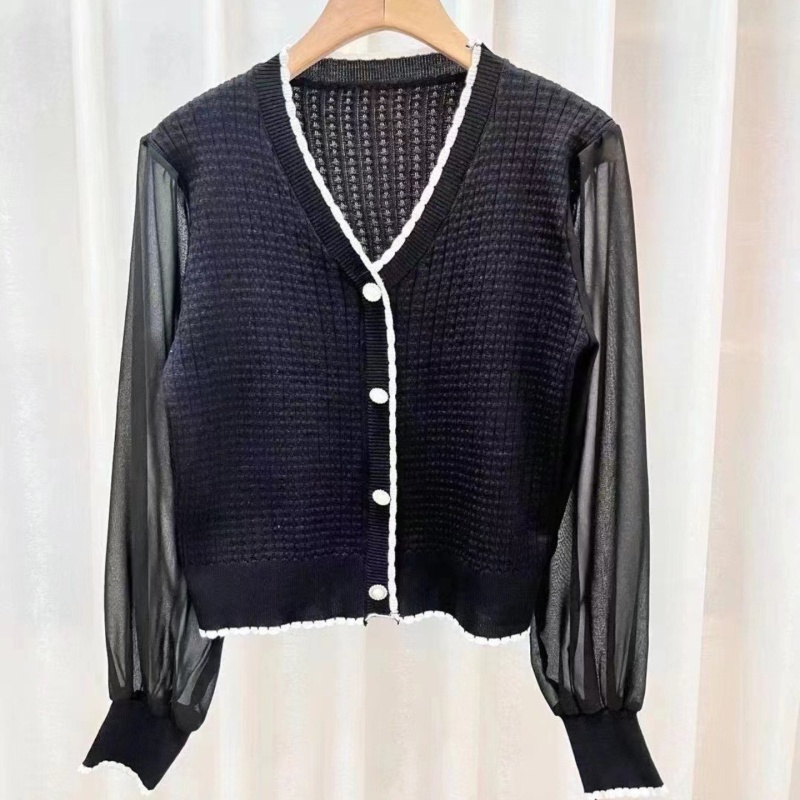秋季新款拼接长袖设计感V领镂空雪纺女时尚气质百搭针织开衫