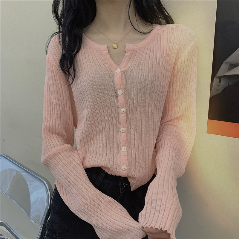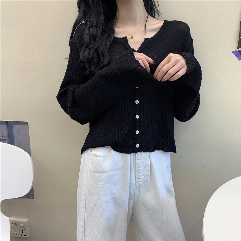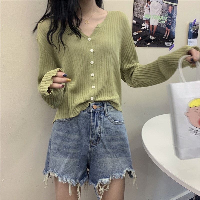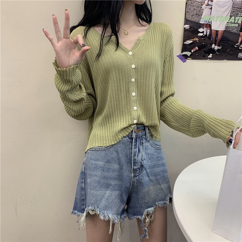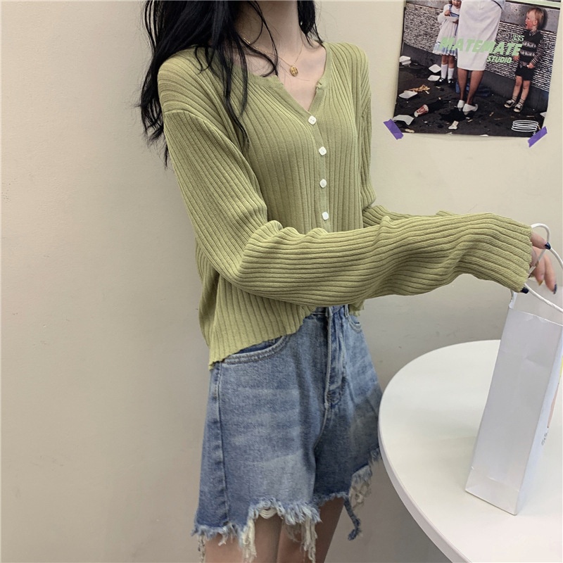 2023新款宽松针织衫女款韩版温柔风V领气质纯色长袖短款开衫上衣