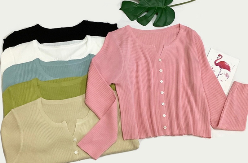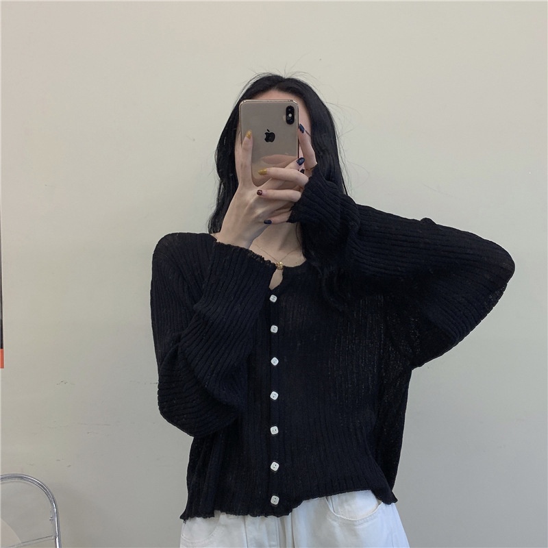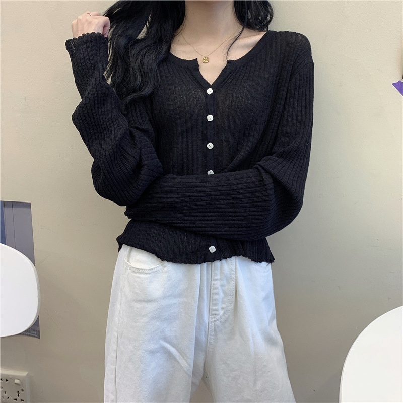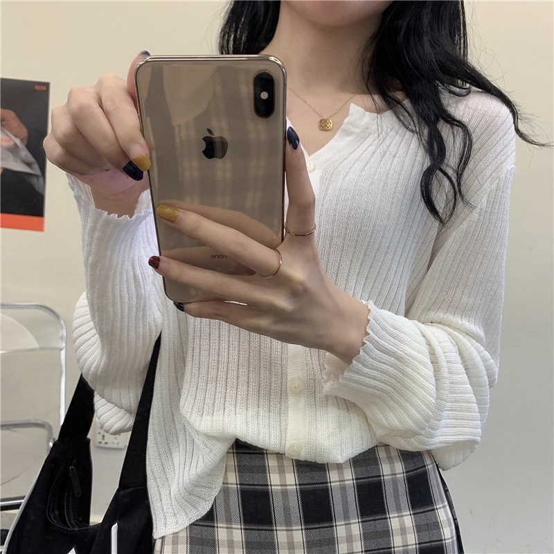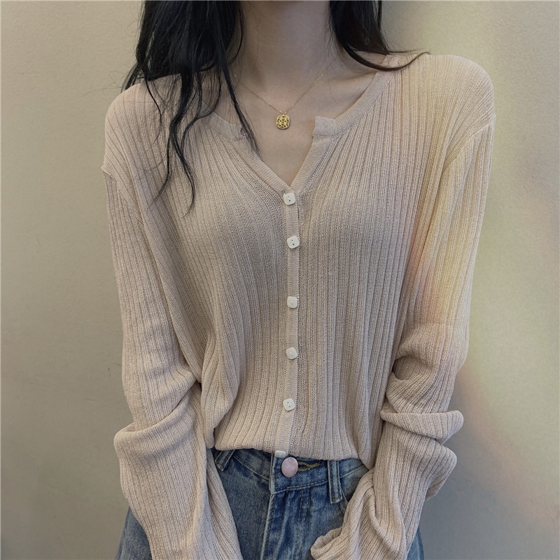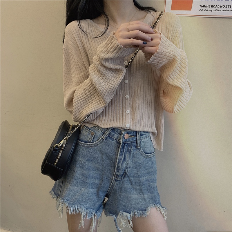 2023新款宽松针织衫女款韩版温柔风V领气质纯色长袖短款开衫上衣
