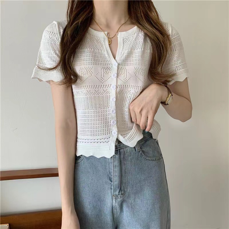 夏季新款镂空针织衫短款短袖甜美可爱V领小开衫修身显瘦上衣女潮