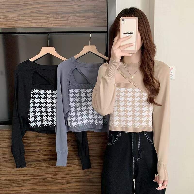 2023早春披肩长袖针织衫女不规则设计感小外套千鸟格吊带背心上衣
