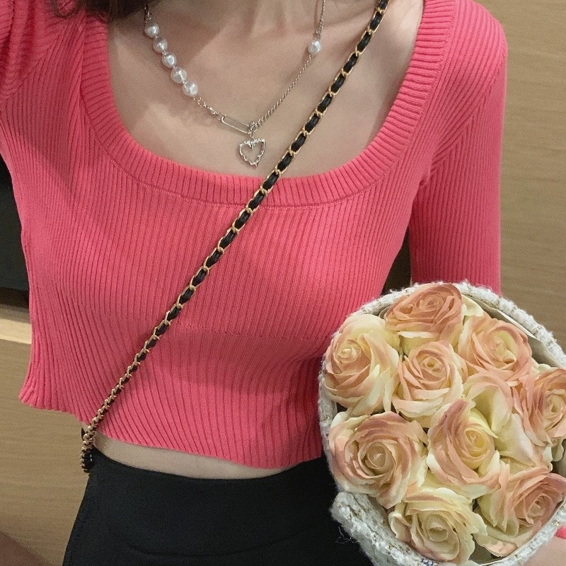 早春纯欲风别致独特方领针织打底衫内搭设计感小众洋气长袖上衣女