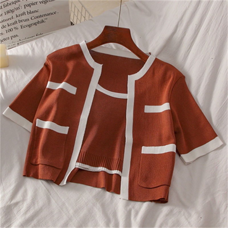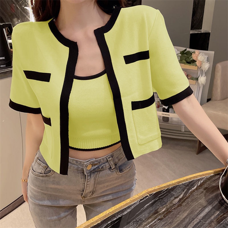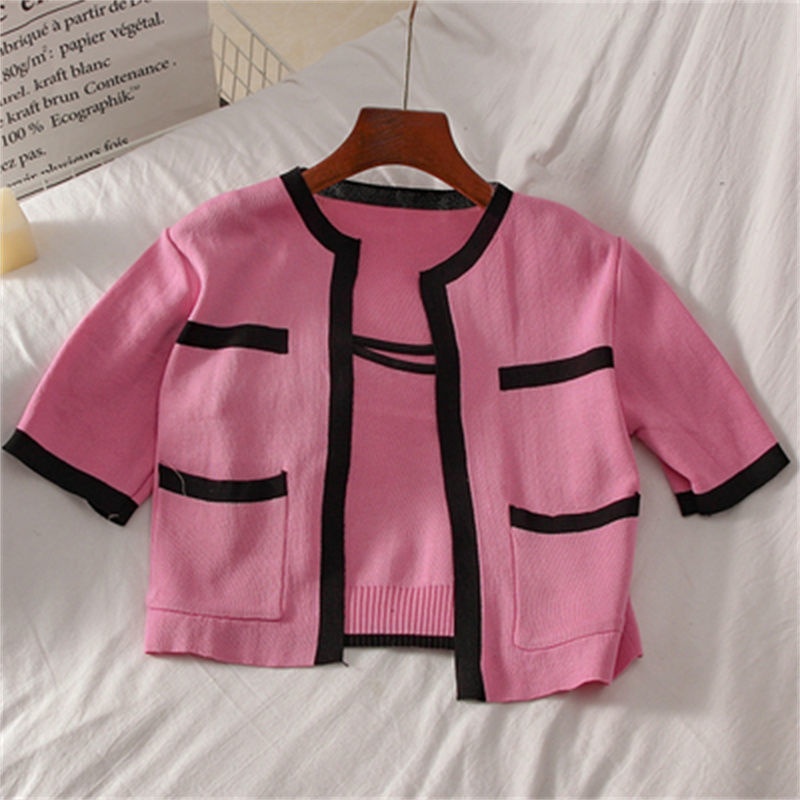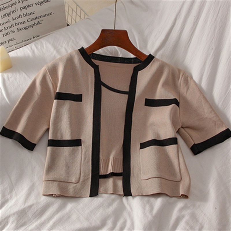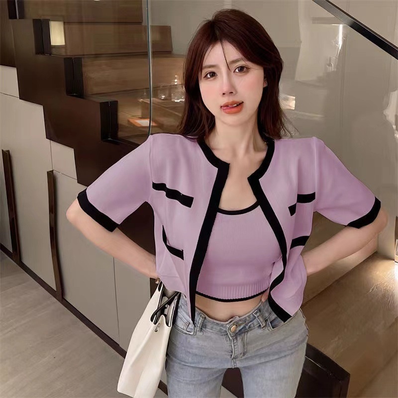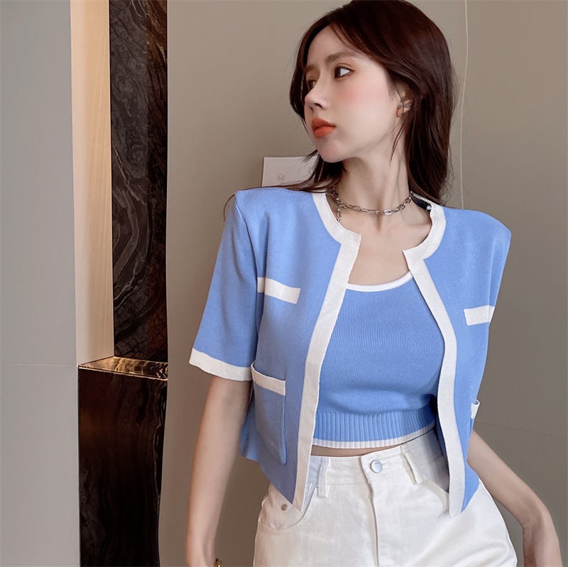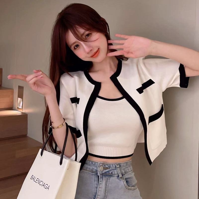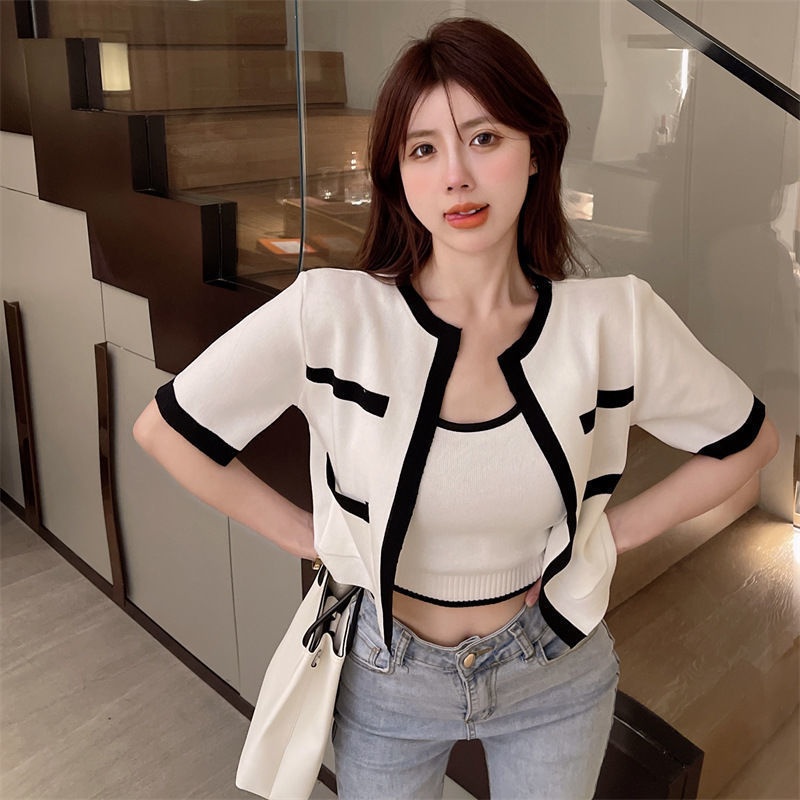 2023春秋小香风针织衫背心两件套韩系上衣女显瘦短袖背心开衫套装