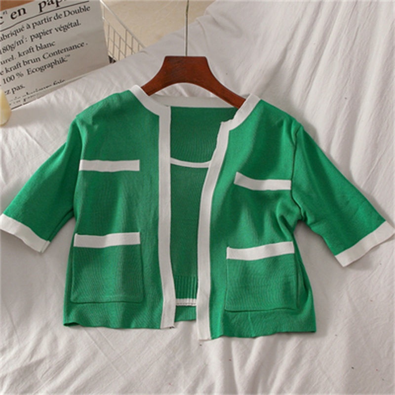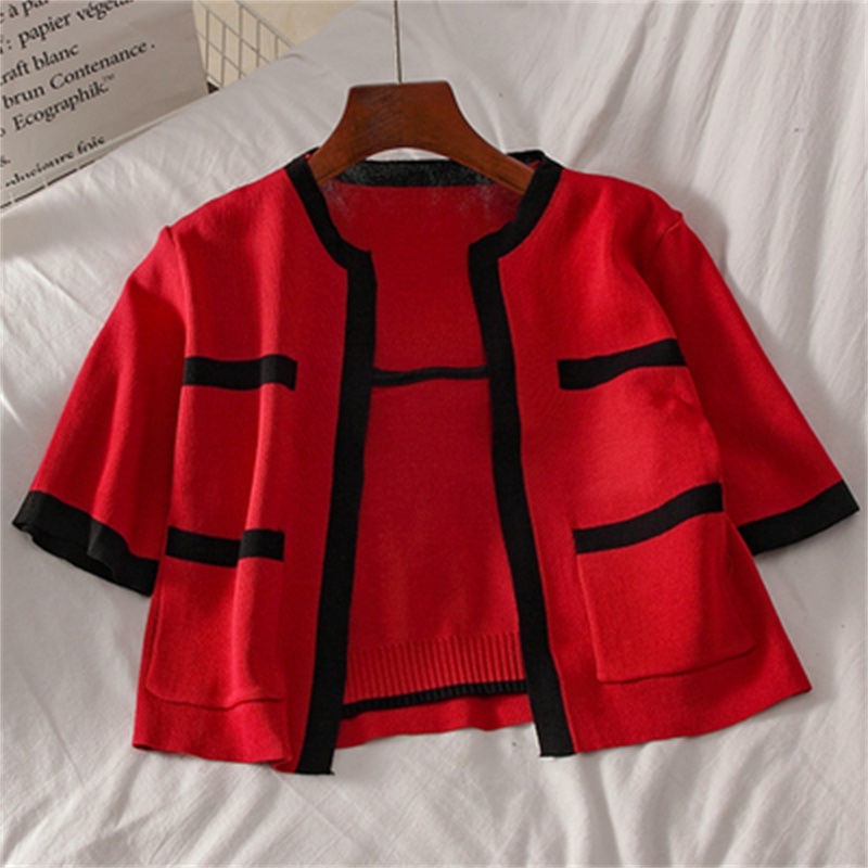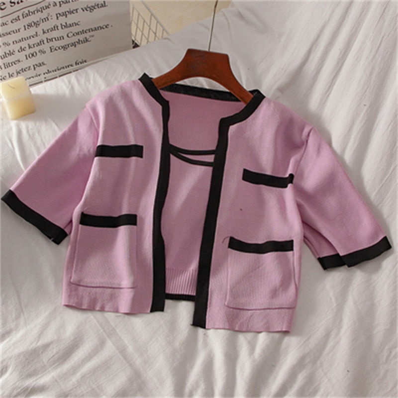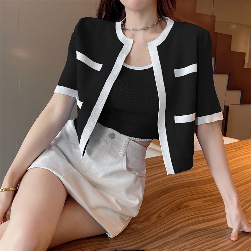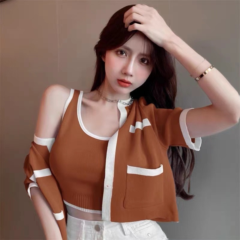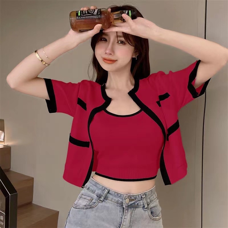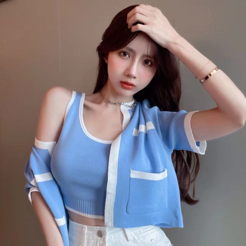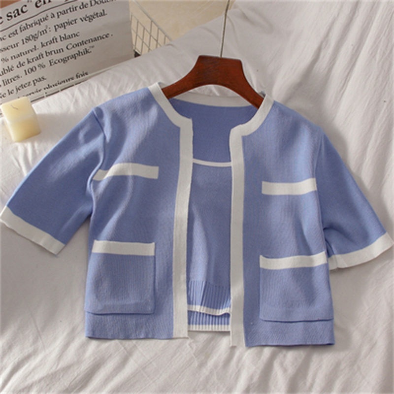 2023春秋小香风针织衫背心两件套韩系上衣女显瘦短袖背心开衫套装