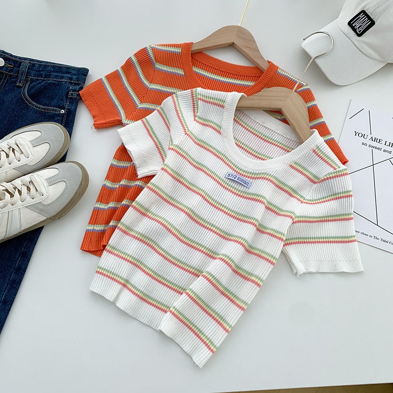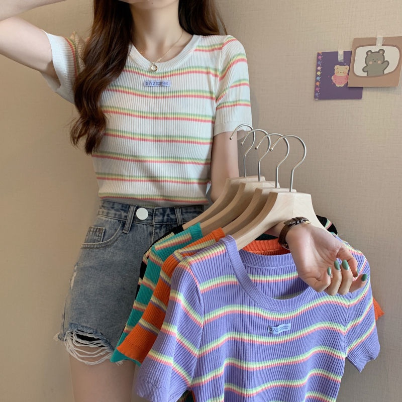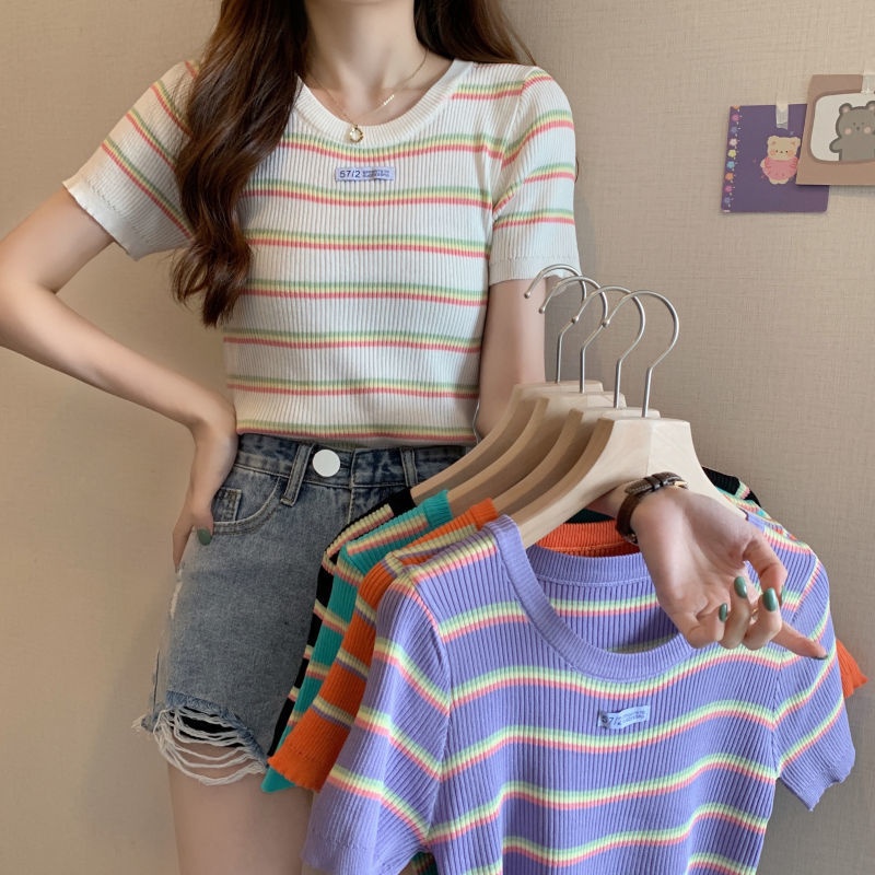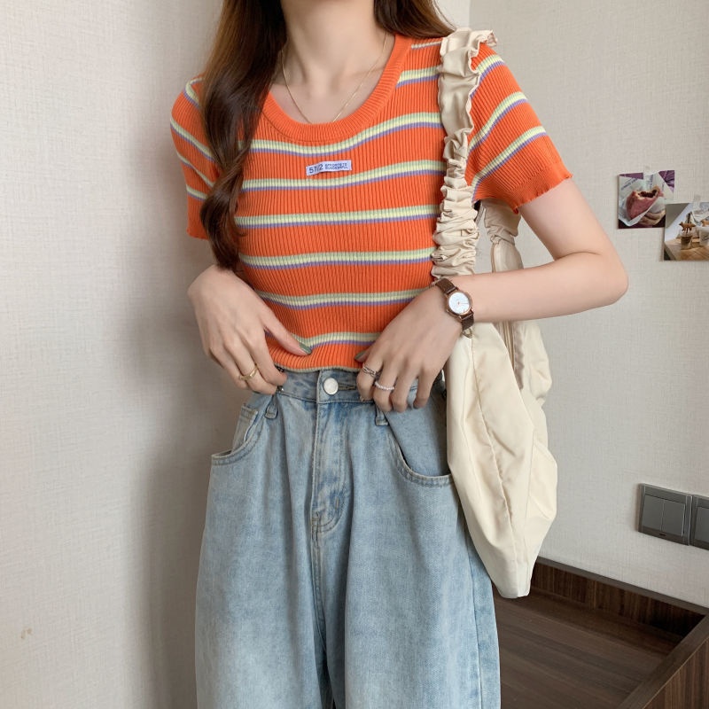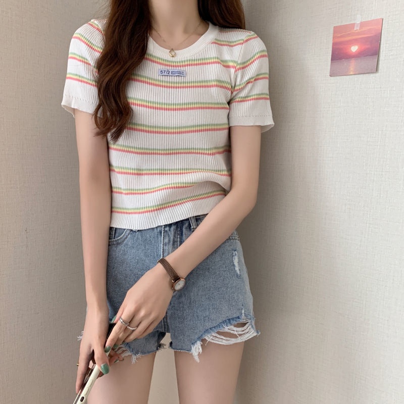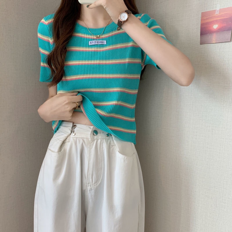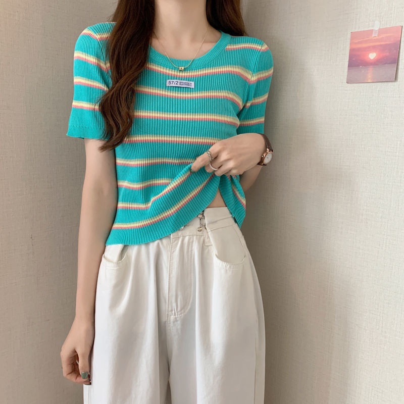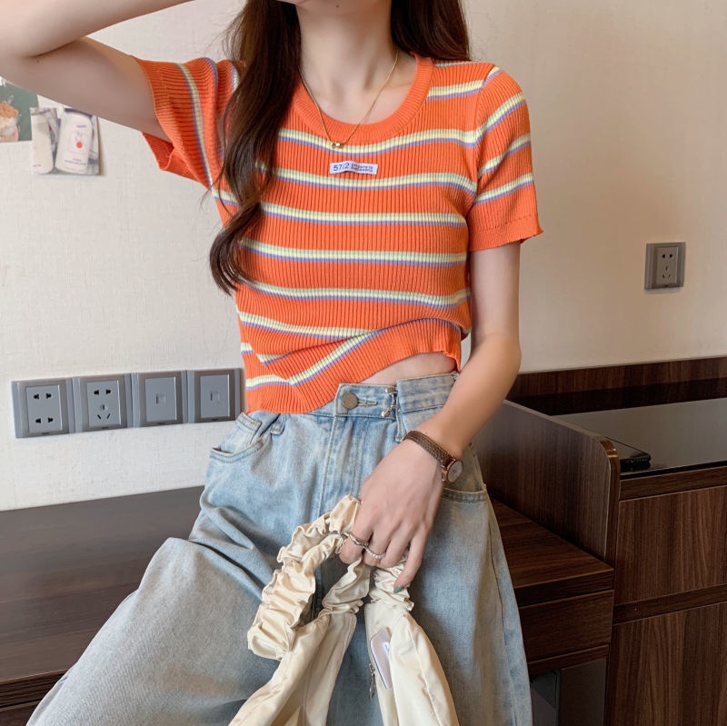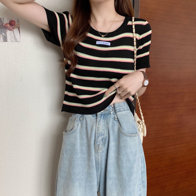 夏季新款快时尚女装新款韩版条纹百搭修身显瘦圆领短袖针织上衣女
