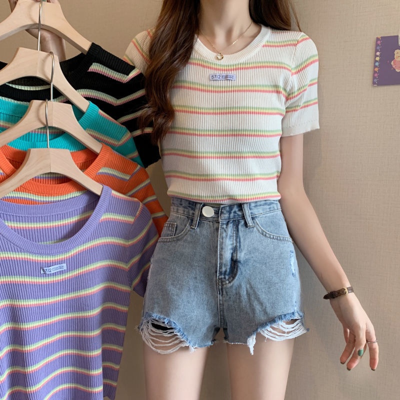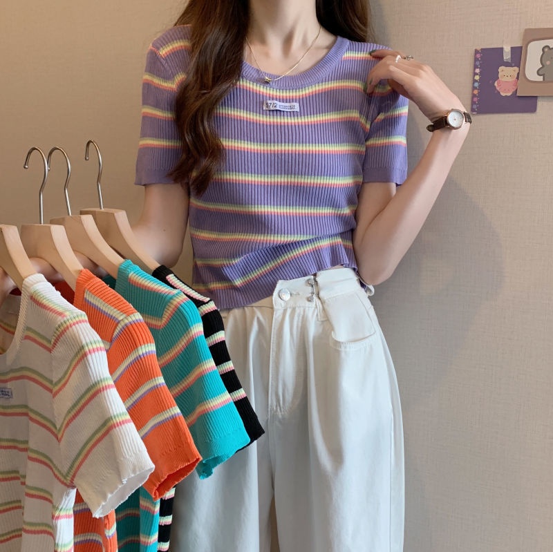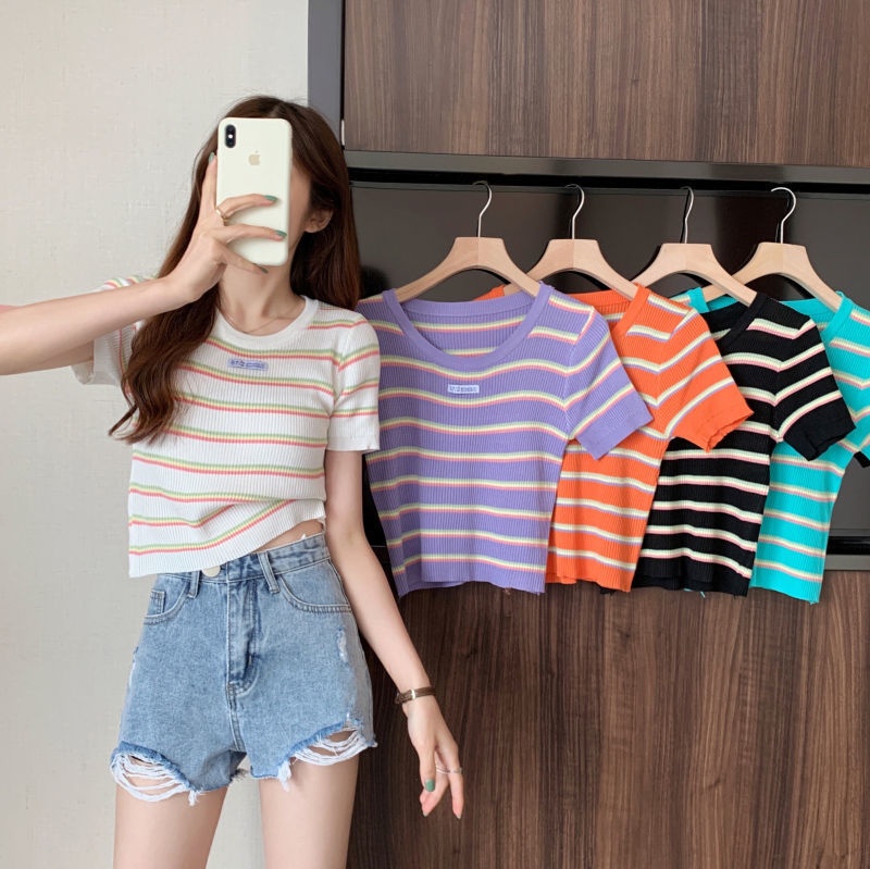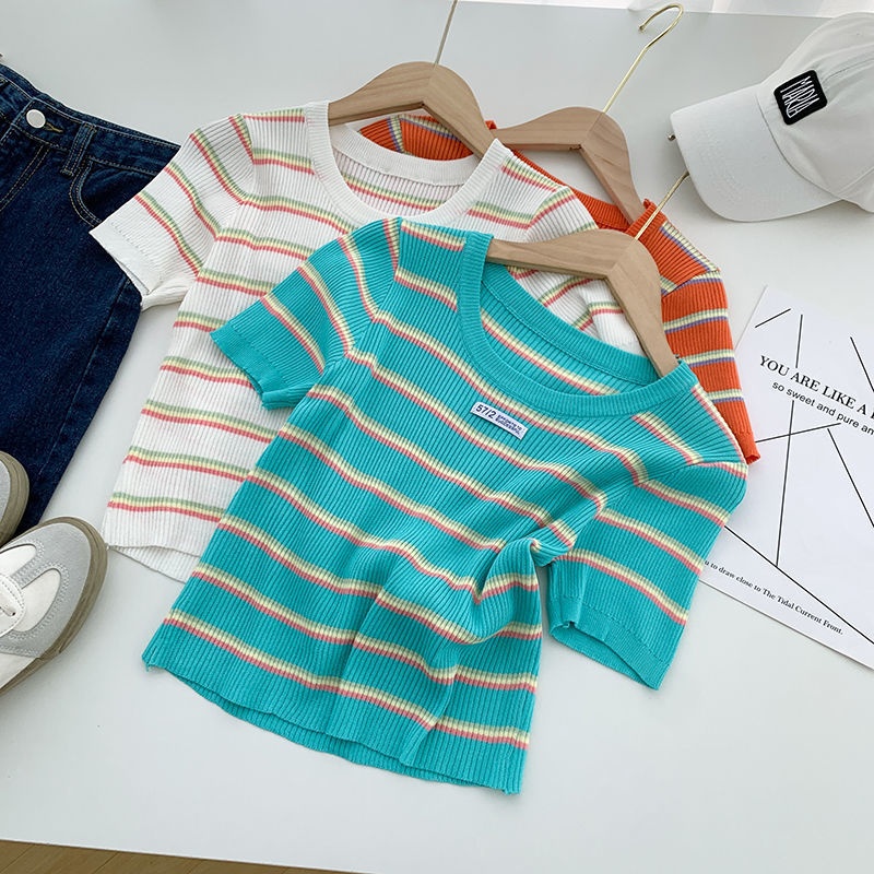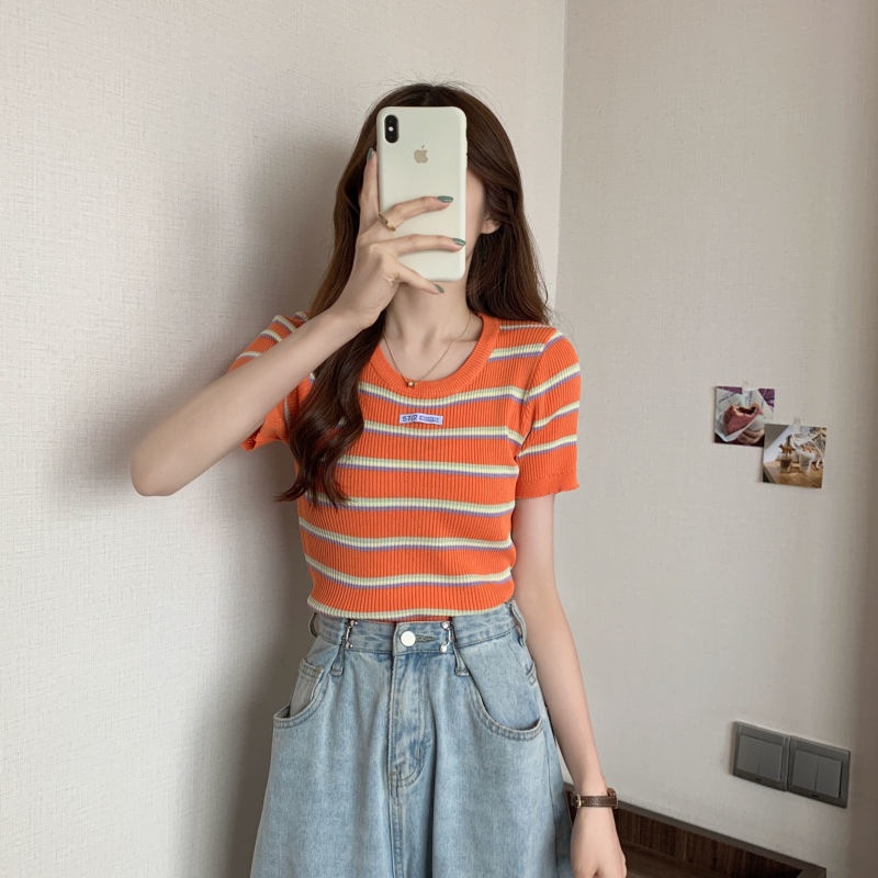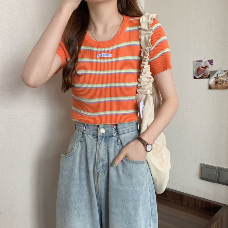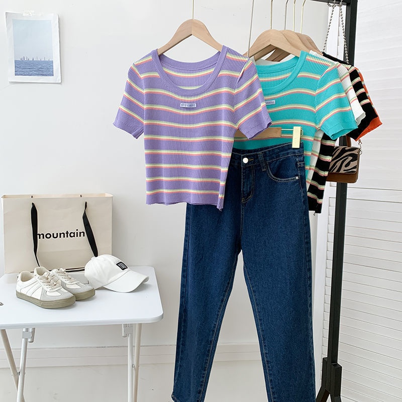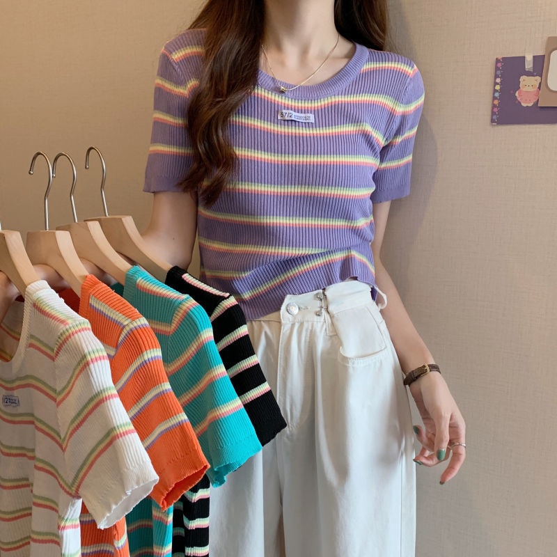 夏季新款快时尚女装新款韩版条纹百搭修身显瘦圆领短袖针织上衣女