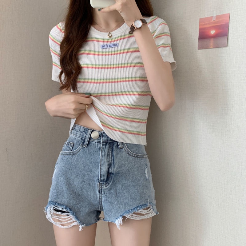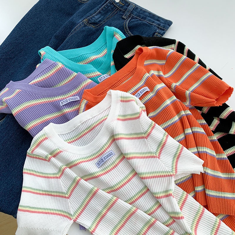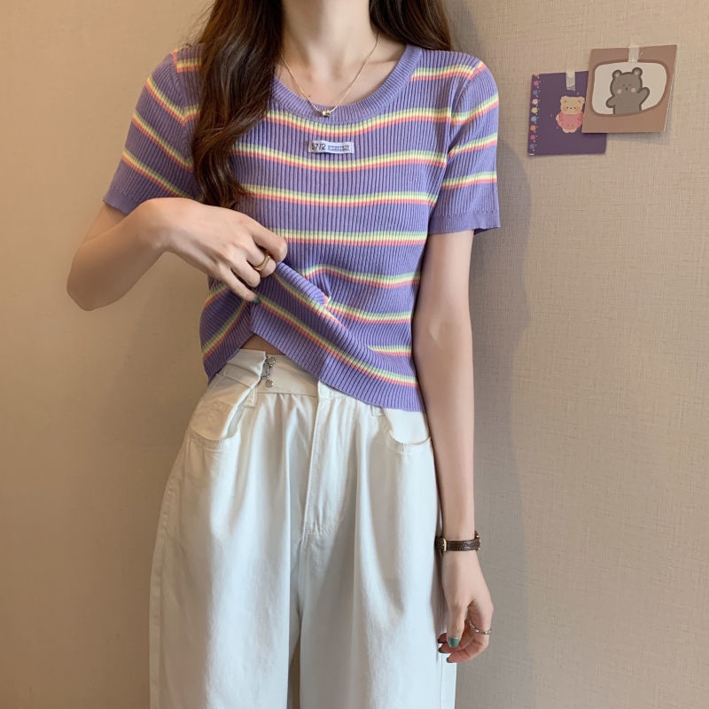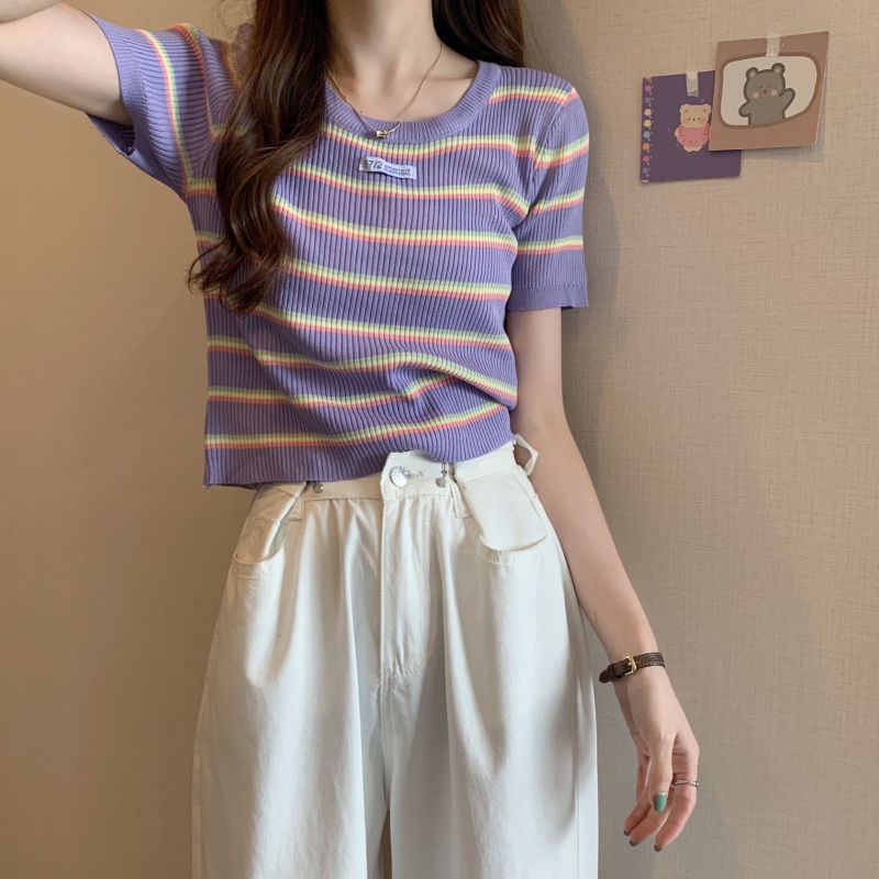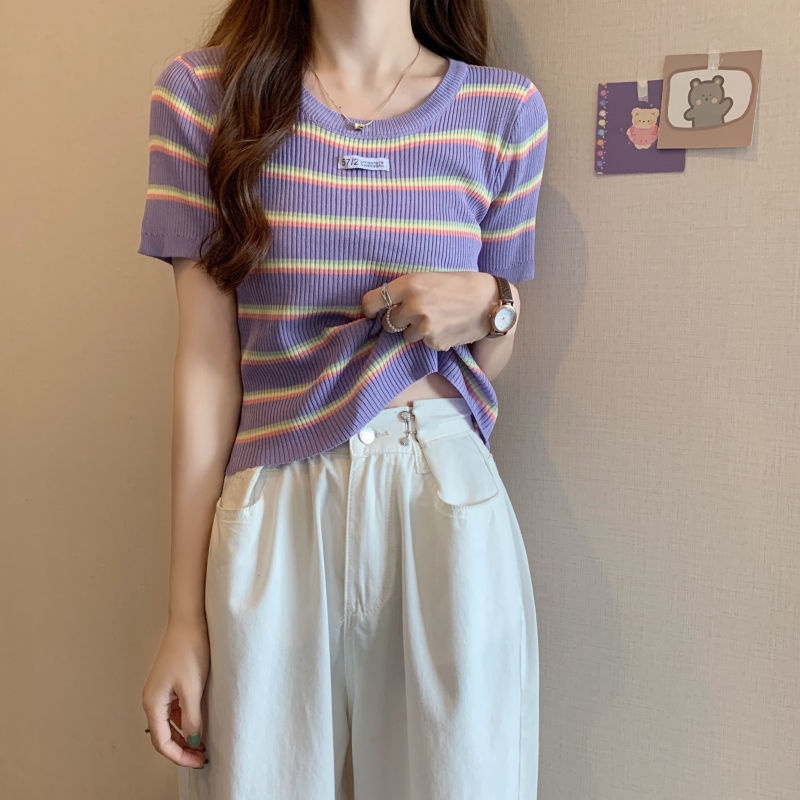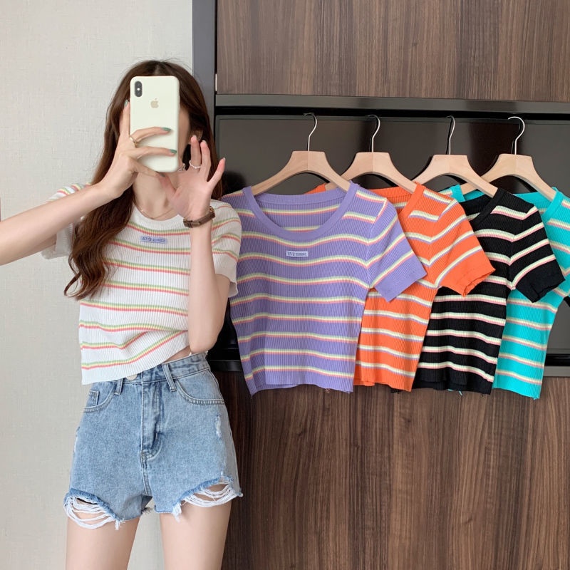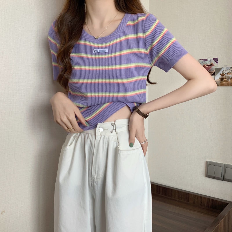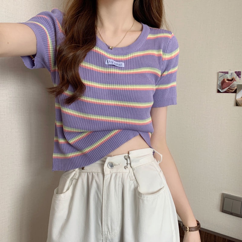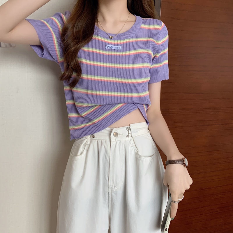 夏季新款快时尚女装新款韩版条纹百搭修身显瘦圆领短袖针织上衣女