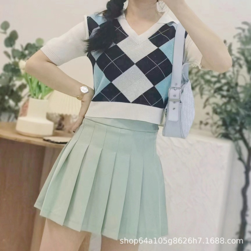 韩版网红辣妹穿搭上衣马甲纯欲气质小个子拼接棋盘针织背心上衣女