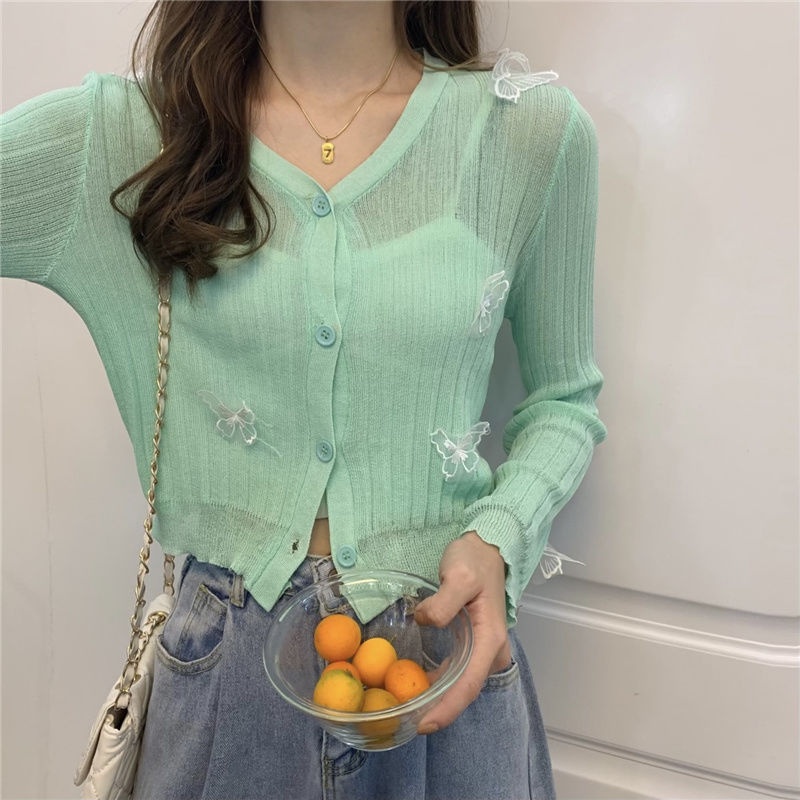 夏季温柔风立体蝴蝶喇叭袖针织开衫V领薄款冰丝防晒修身长袖上衣