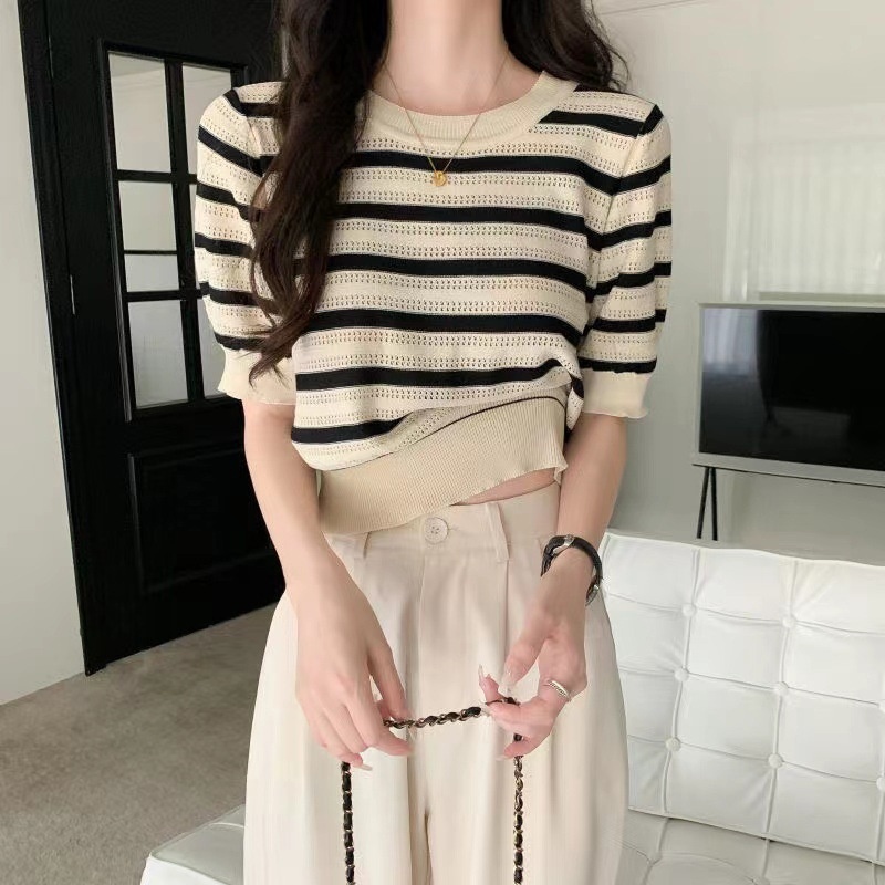 条纹针织衫女夏季新款圆领薄款短款短款微透修身百搭上衣女小衫潮