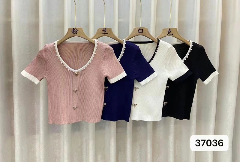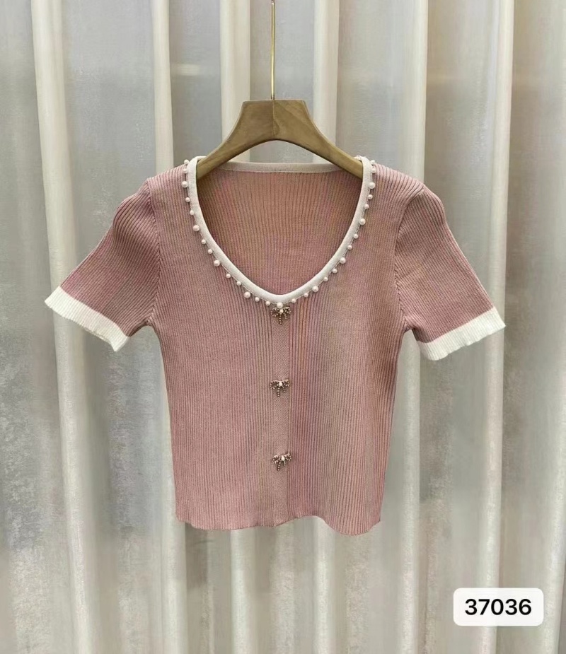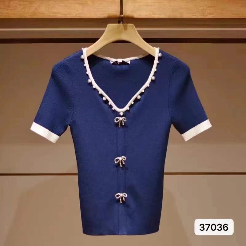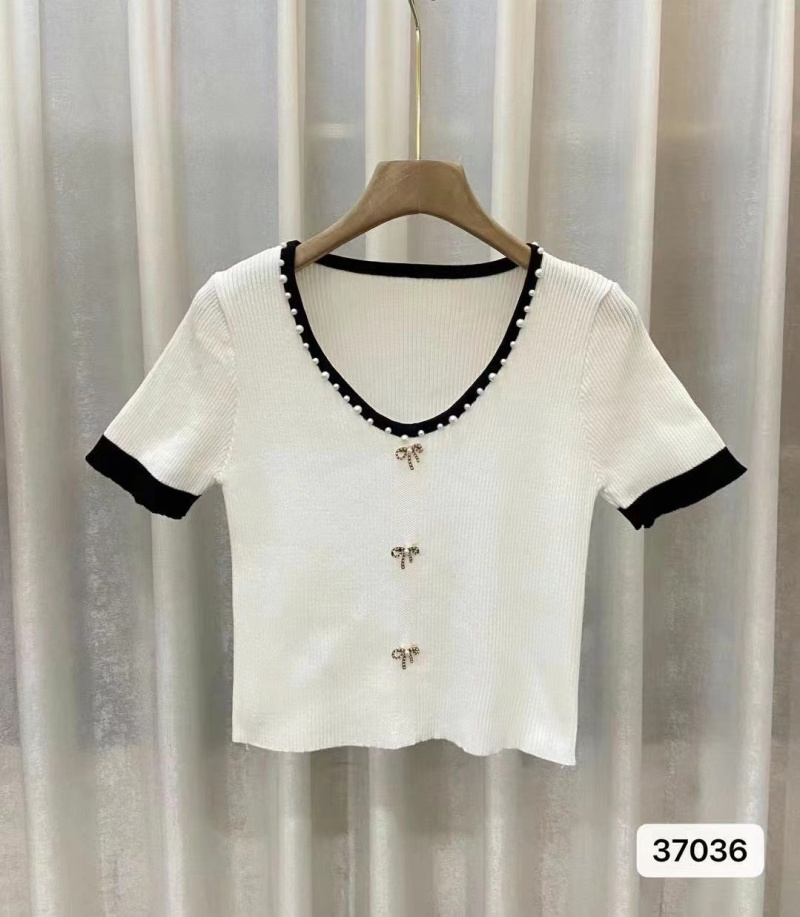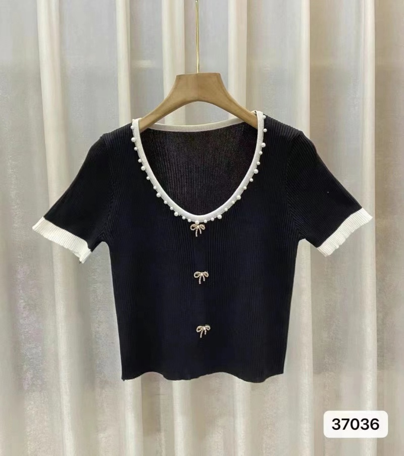 2023年夏季新款名媛温柔气质通勤桃心领钉珠金属扣短袖上衣潮款女