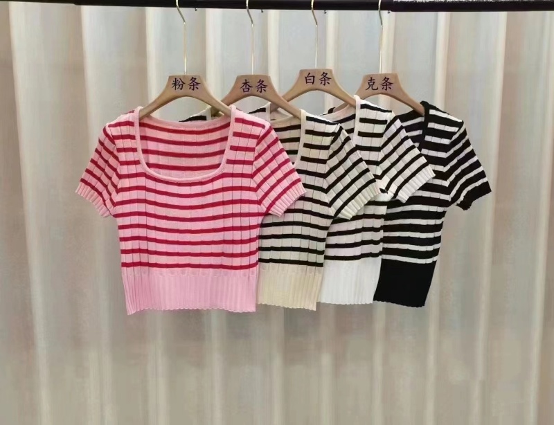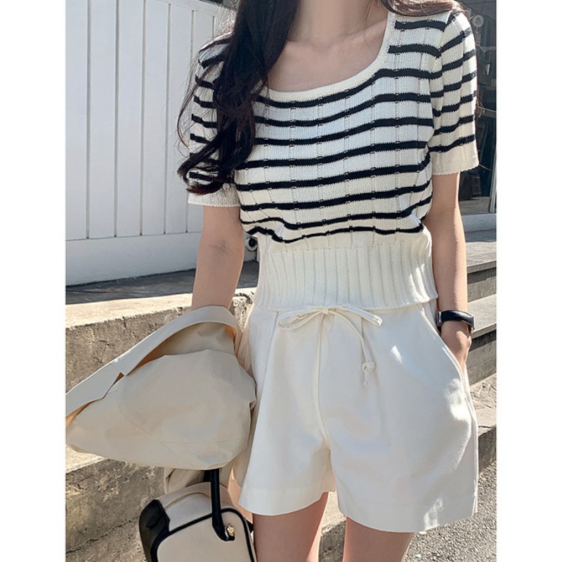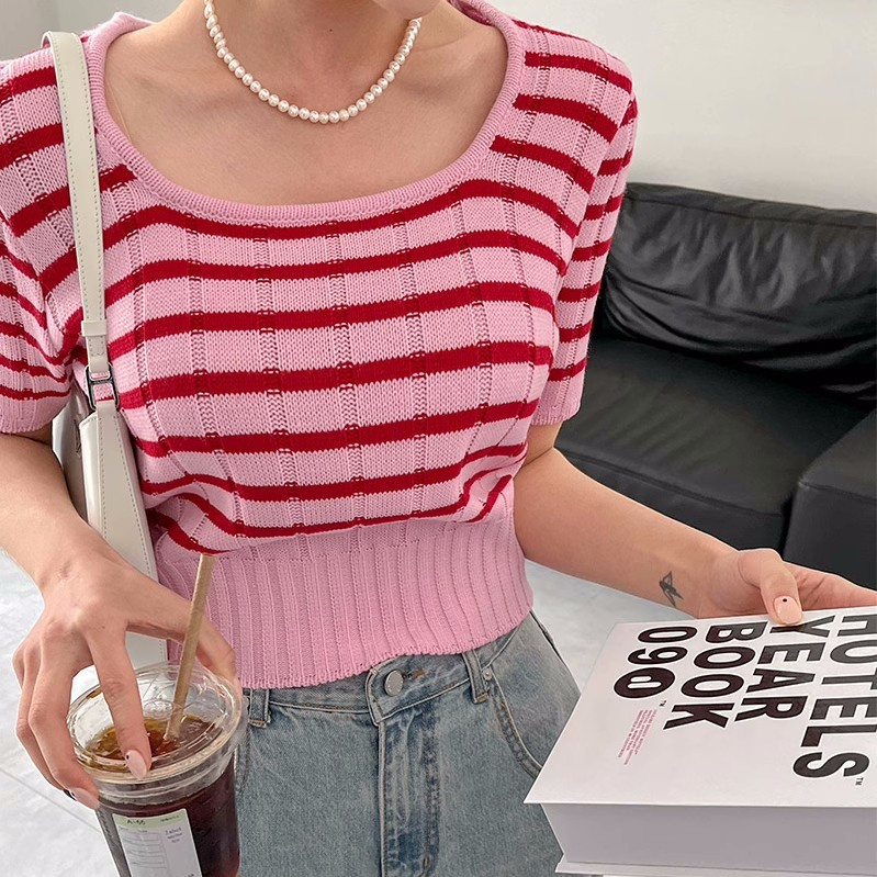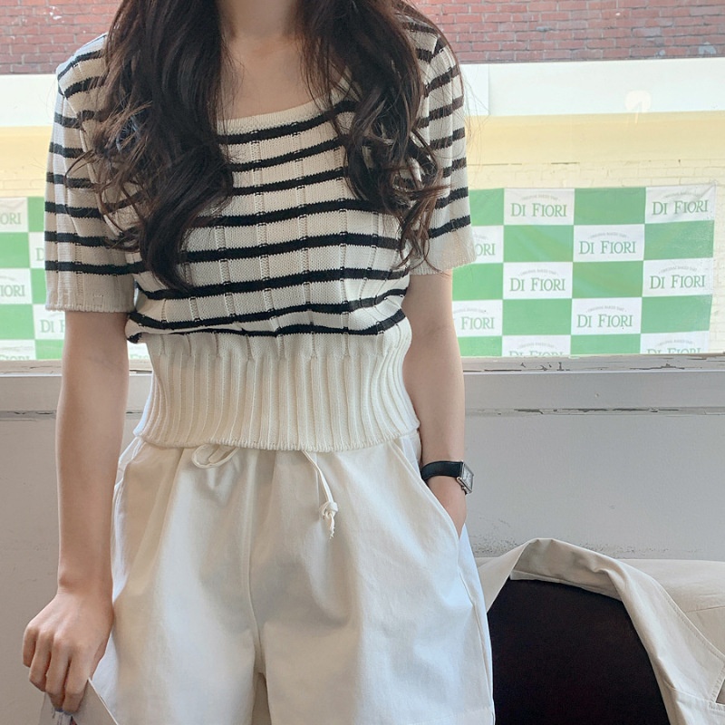 短袖针织衫女薄款夏季2023新款韩版方领收腰显瘦短款上衣黑白条纹