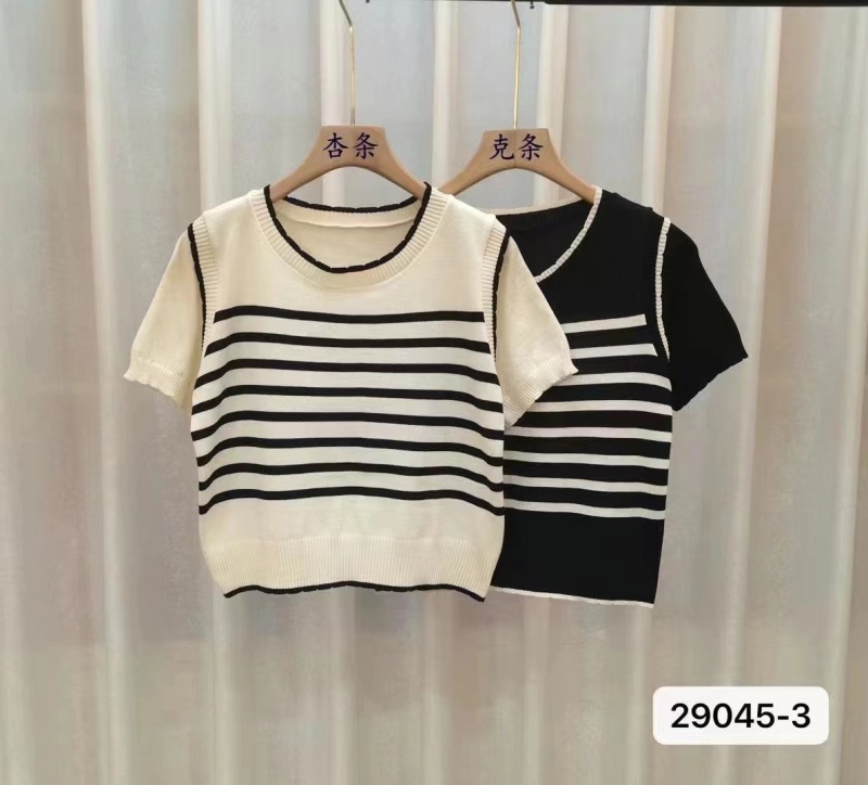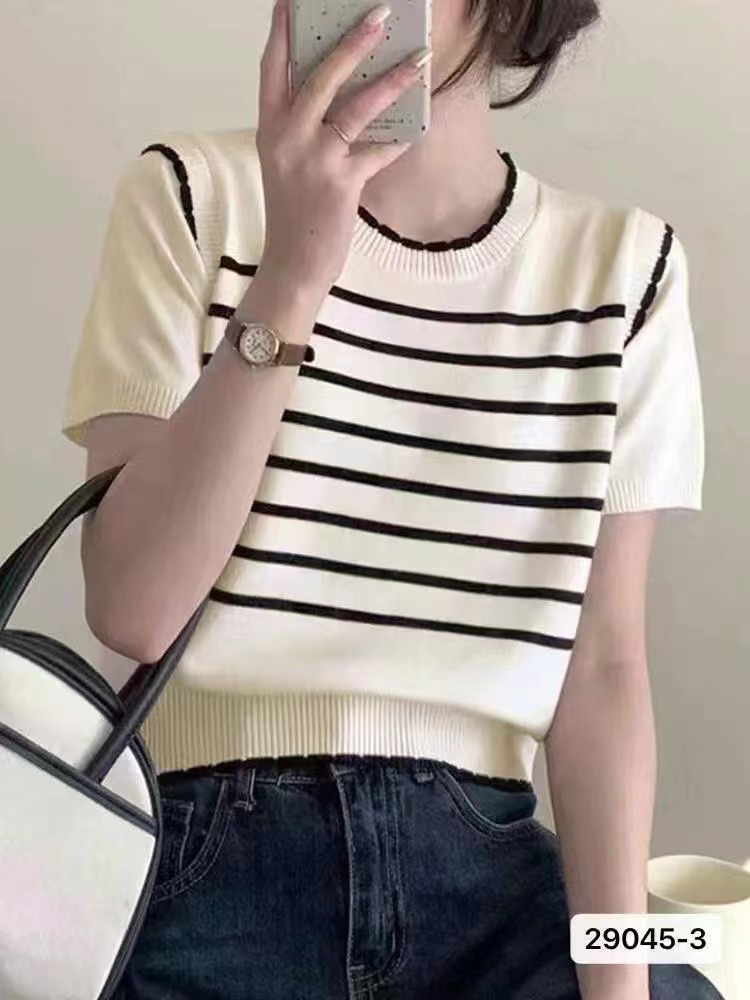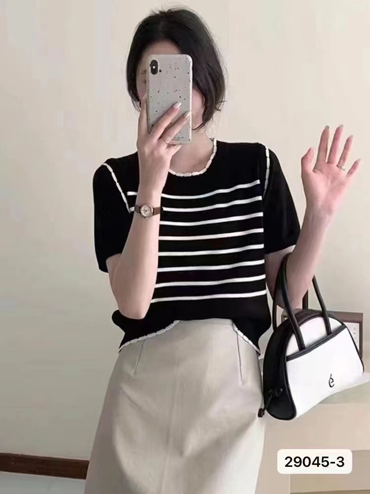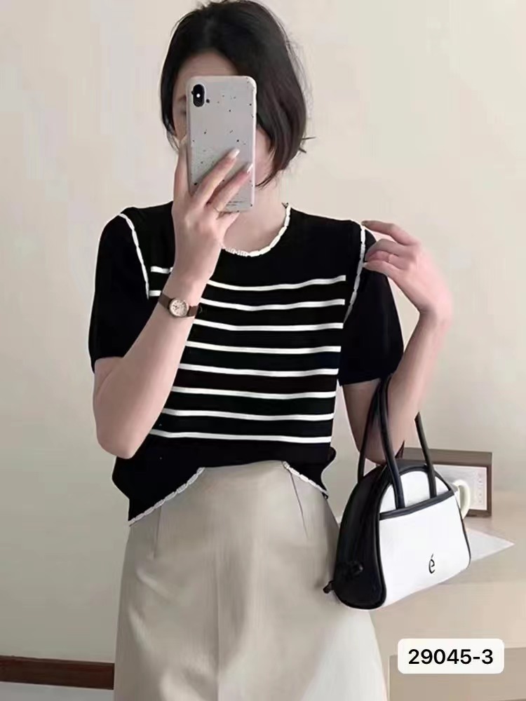 黑白条纹短袖针织衫女夏季设计感小众宽松短款拼接假两件上衣法式