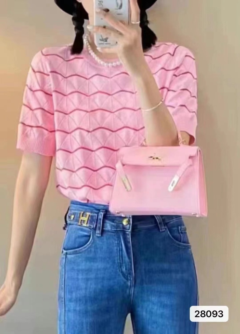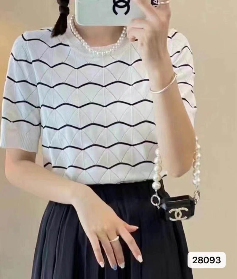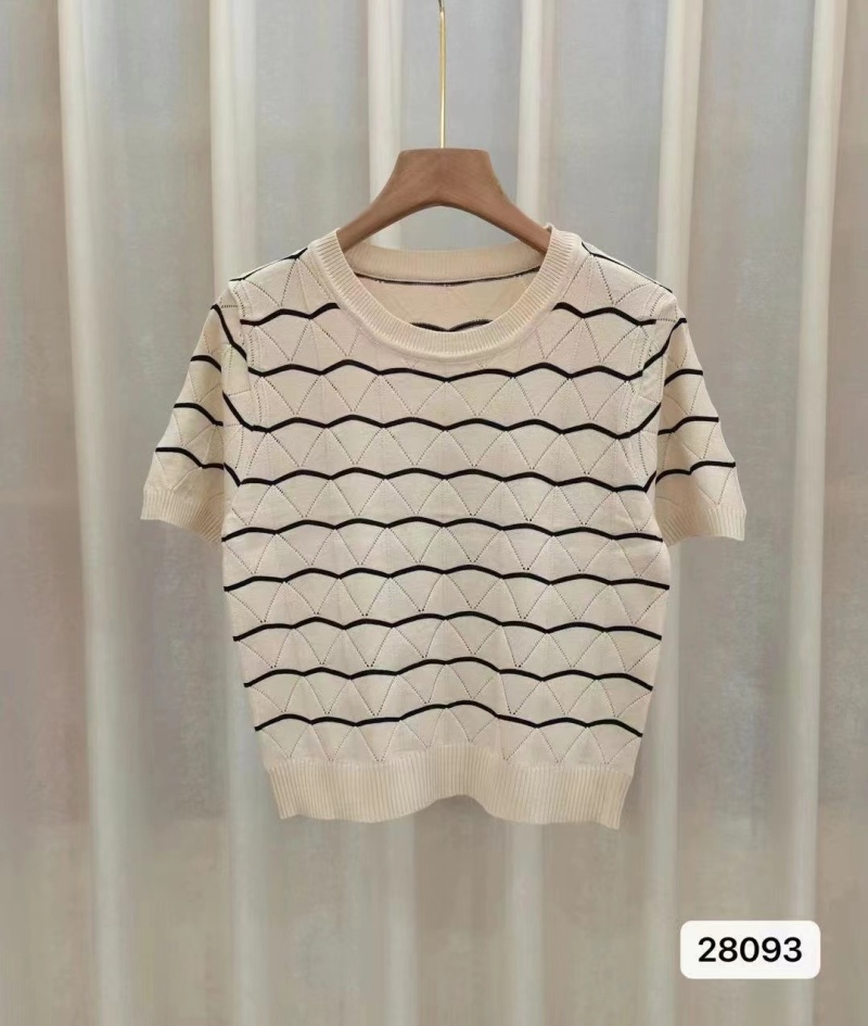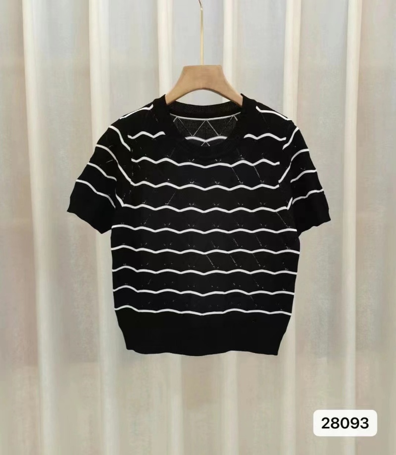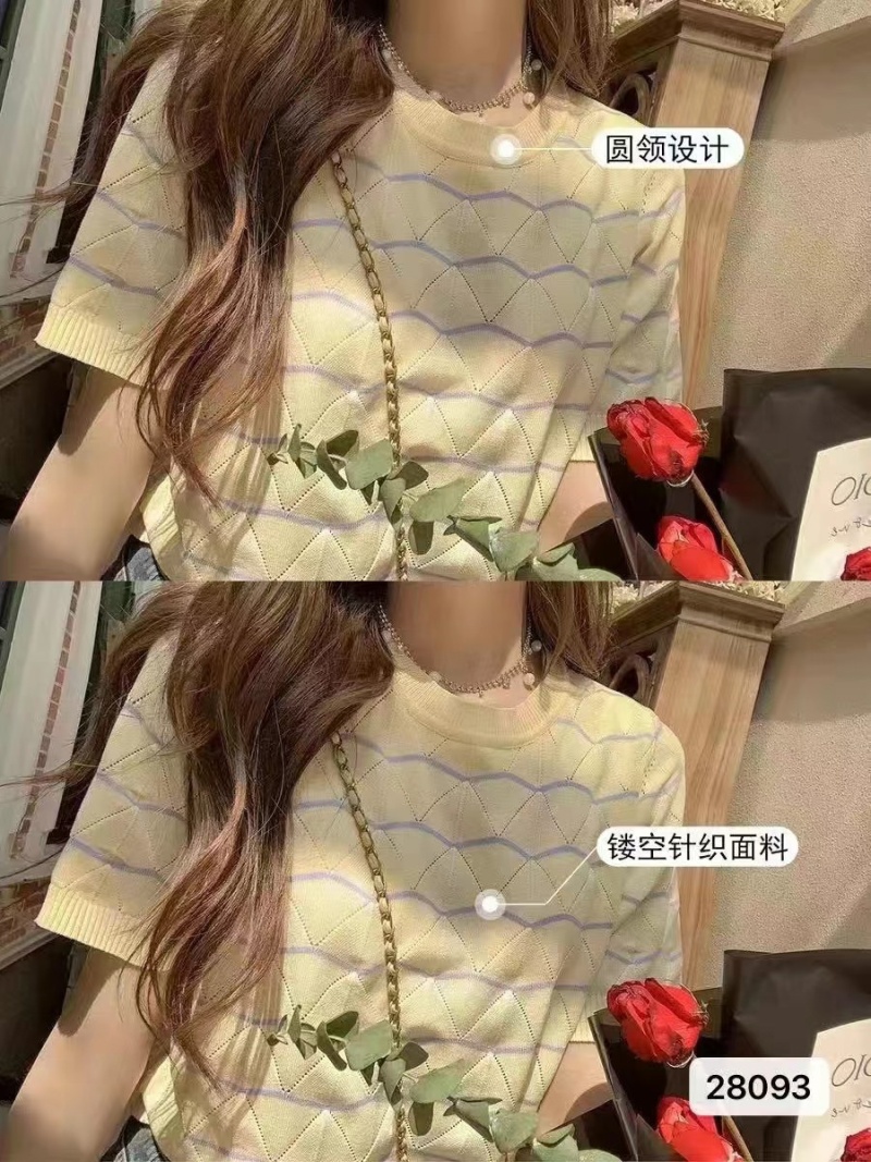 镂空针织衫上衣女2023夏季新款显瘦百搭圆领针织短袖波浪条纹潮款