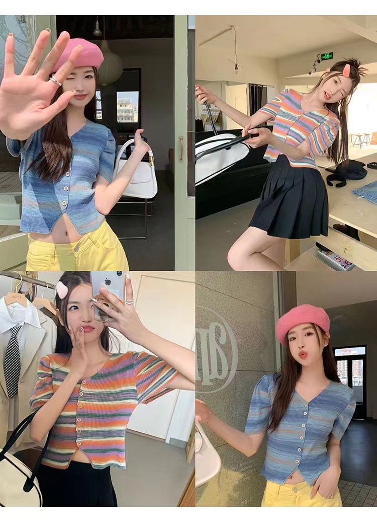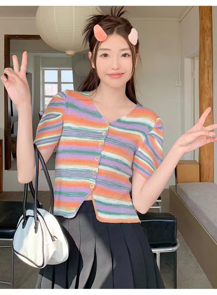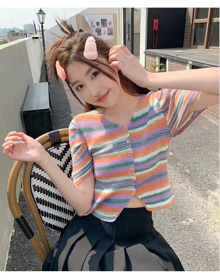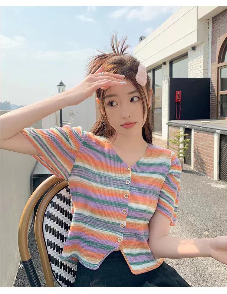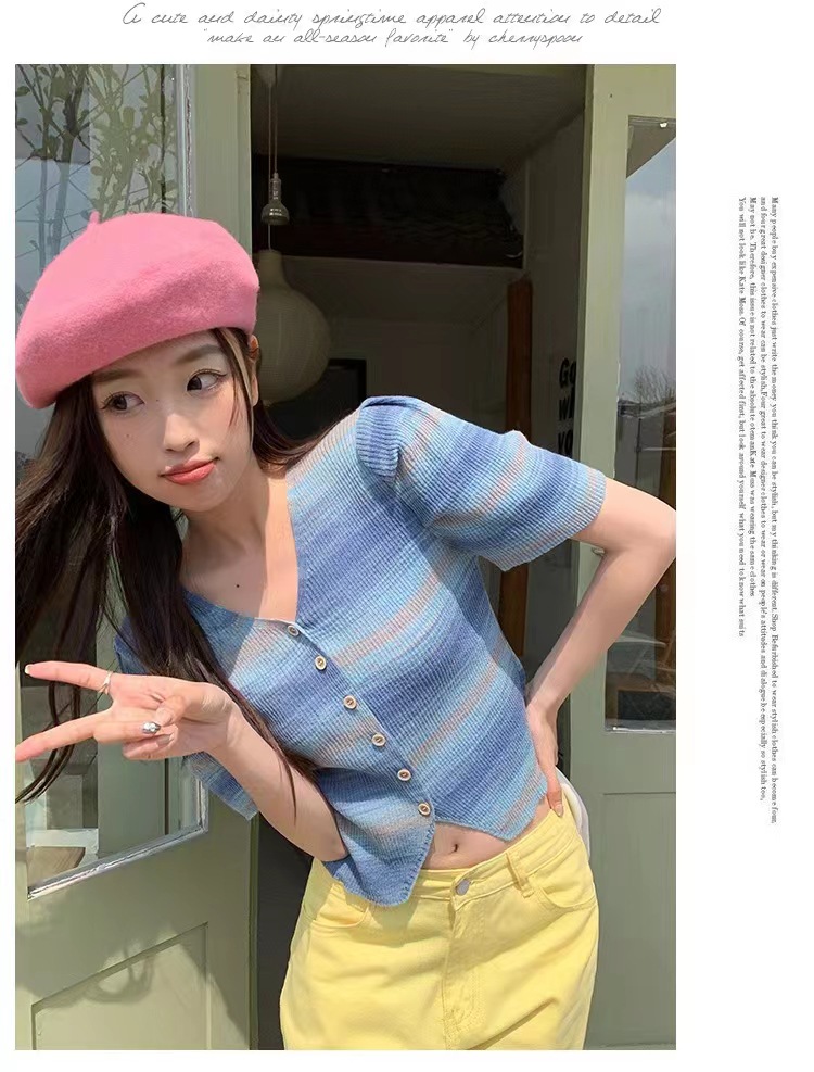 v领t条纹小众别致修身短款小个子短袖针织上衣女春夏新款韩系复古