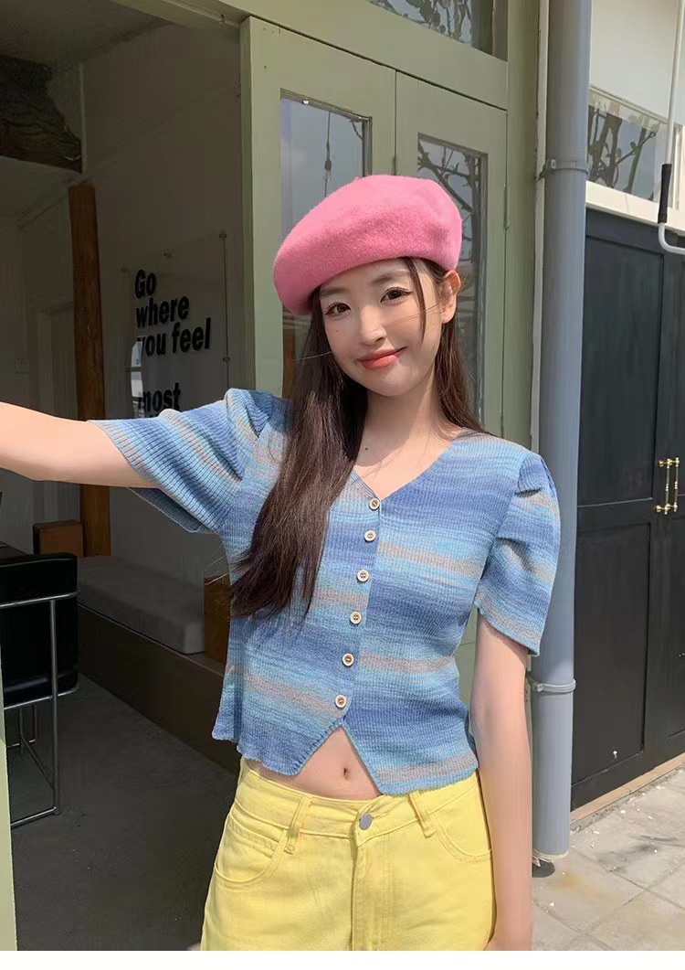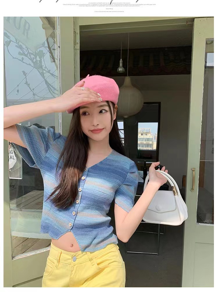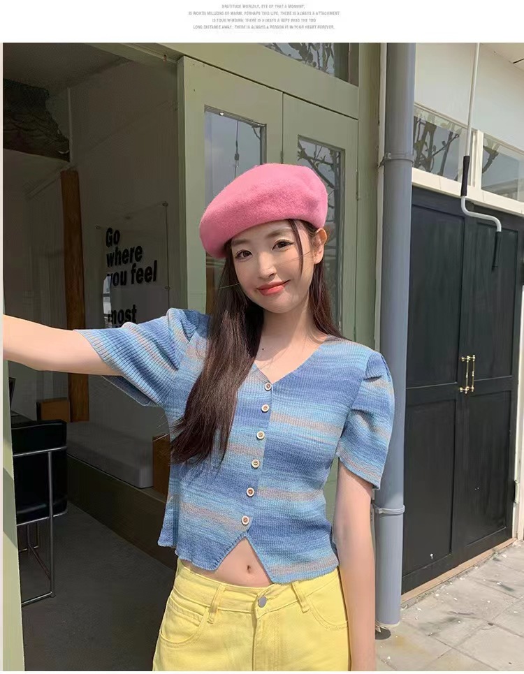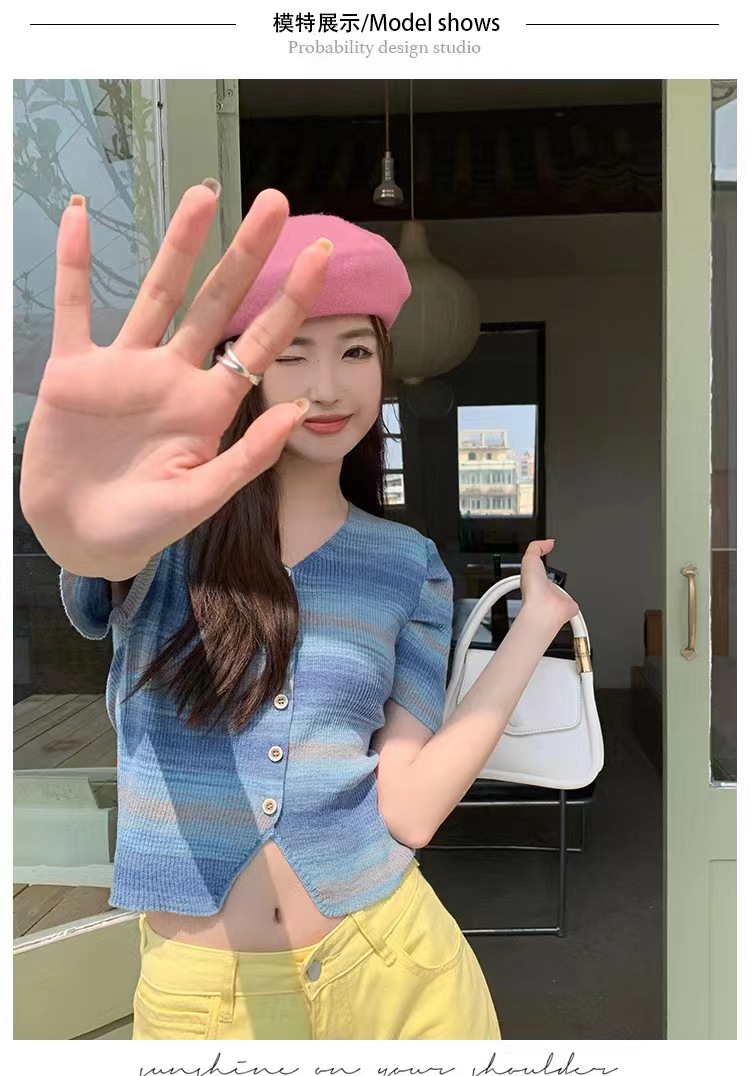 v领t条纹小众别致修身短款小个子短袖针织上衣女春夏新款韩系复古