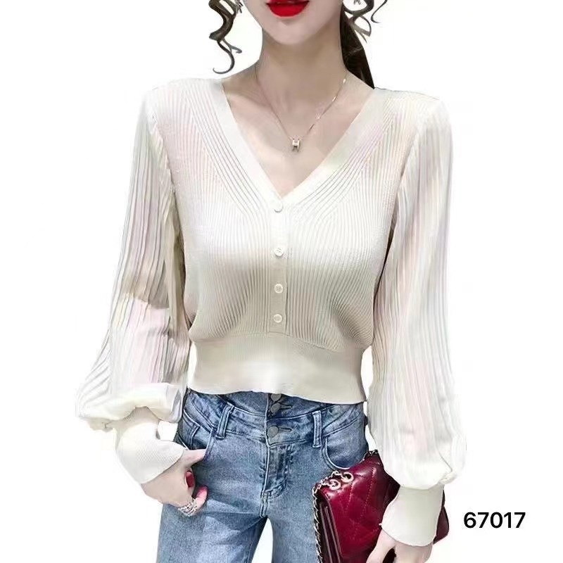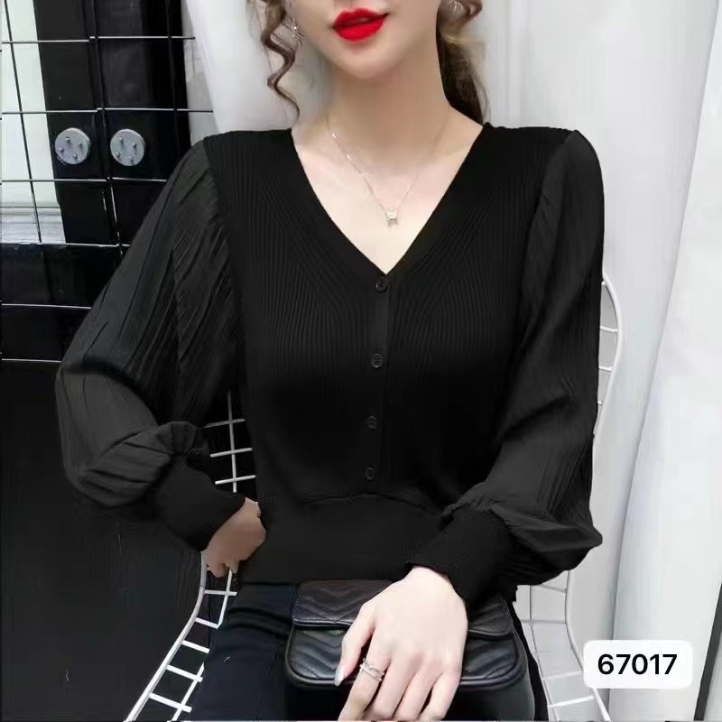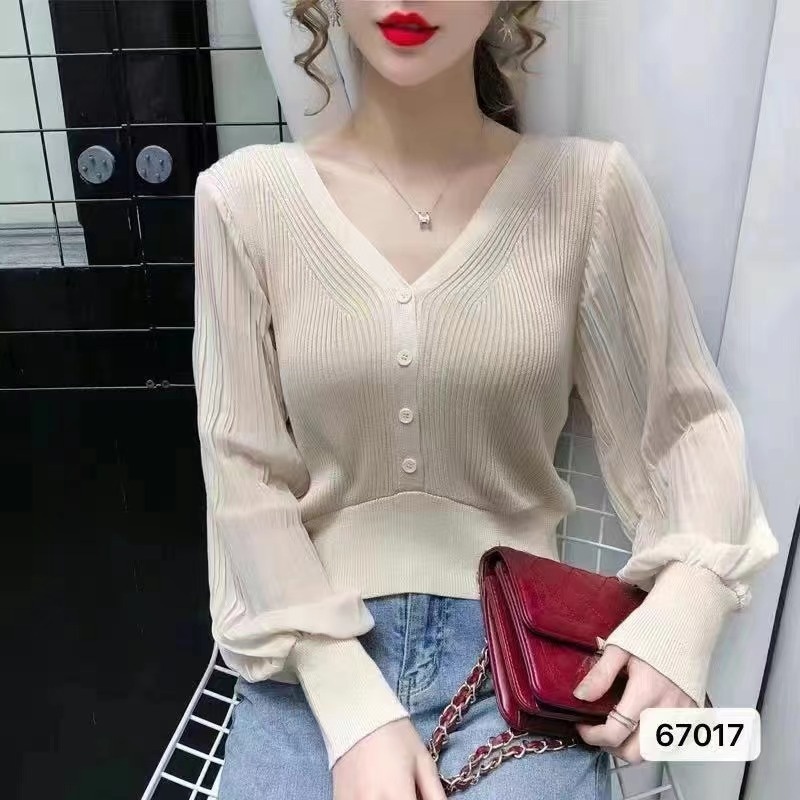 2023年夏季新款韩版设计感洋气减龄Vv领排扣修身灯笼袖上衣女新潮