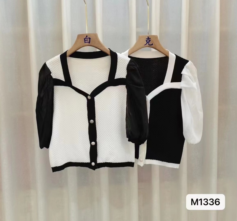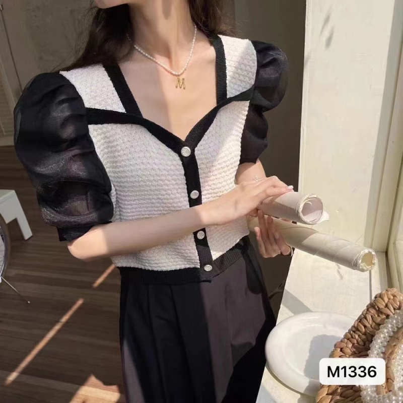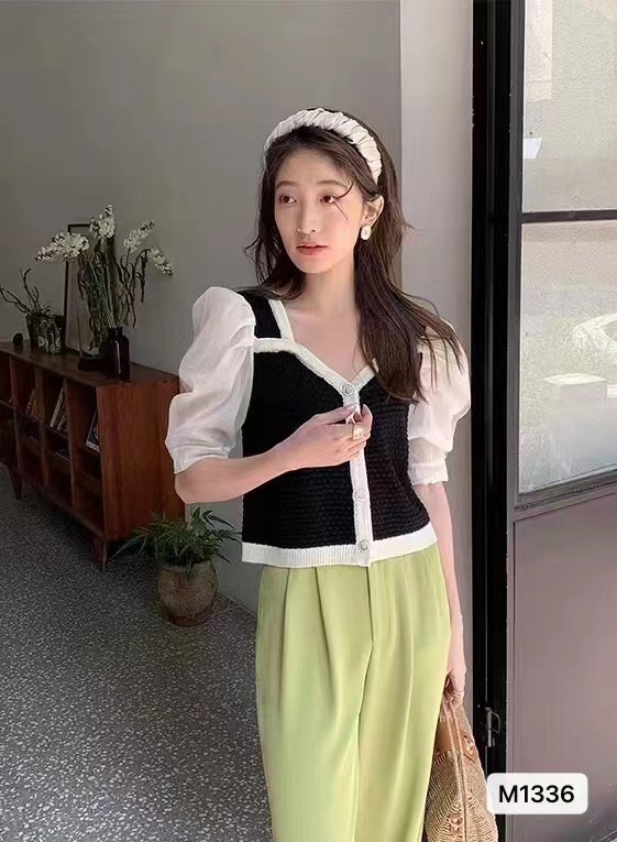 新款Vv领冰丝针织衫女泡泡袖2023夏季时尚气质温柔风洋气开衫上衣